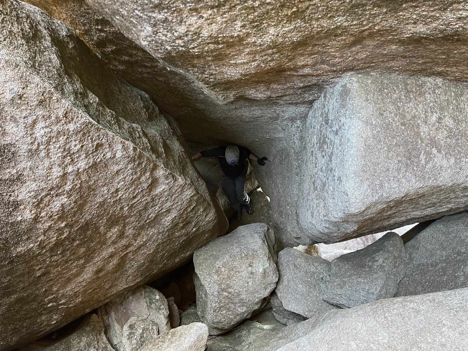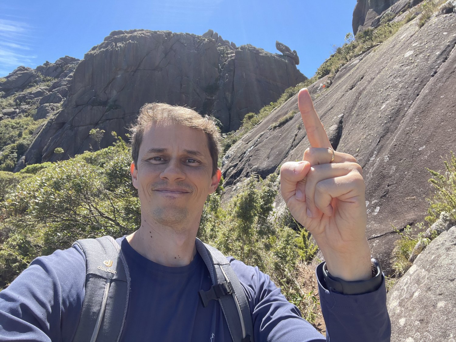 Encontramos um bom lugar para o lanche do almoço e para curtir a vista da região. Me arrisquei mais um pouco em um lance de escalaminhada "um tanto tensa" que precisa de muito cuidado com as agarras e ponto de apoios para os pés. Ufa, dali até o cume da Asa de Hermes é uma subida curta e bem íngreme, mas sem muitos perrengues. No cume encontrei grande blocos de pedras, me embranhei por debaixo de um deles, fuçei aqui e acolá e não econtrei o livro de cume. Achei que o formato da Asa de Hermes se perdia lá do alto, mas na verdade, depois que desci, percebi que ela estava mais na borda em outro ponto, ou seja, tenho uma boa desculpa para voltar rsrs!