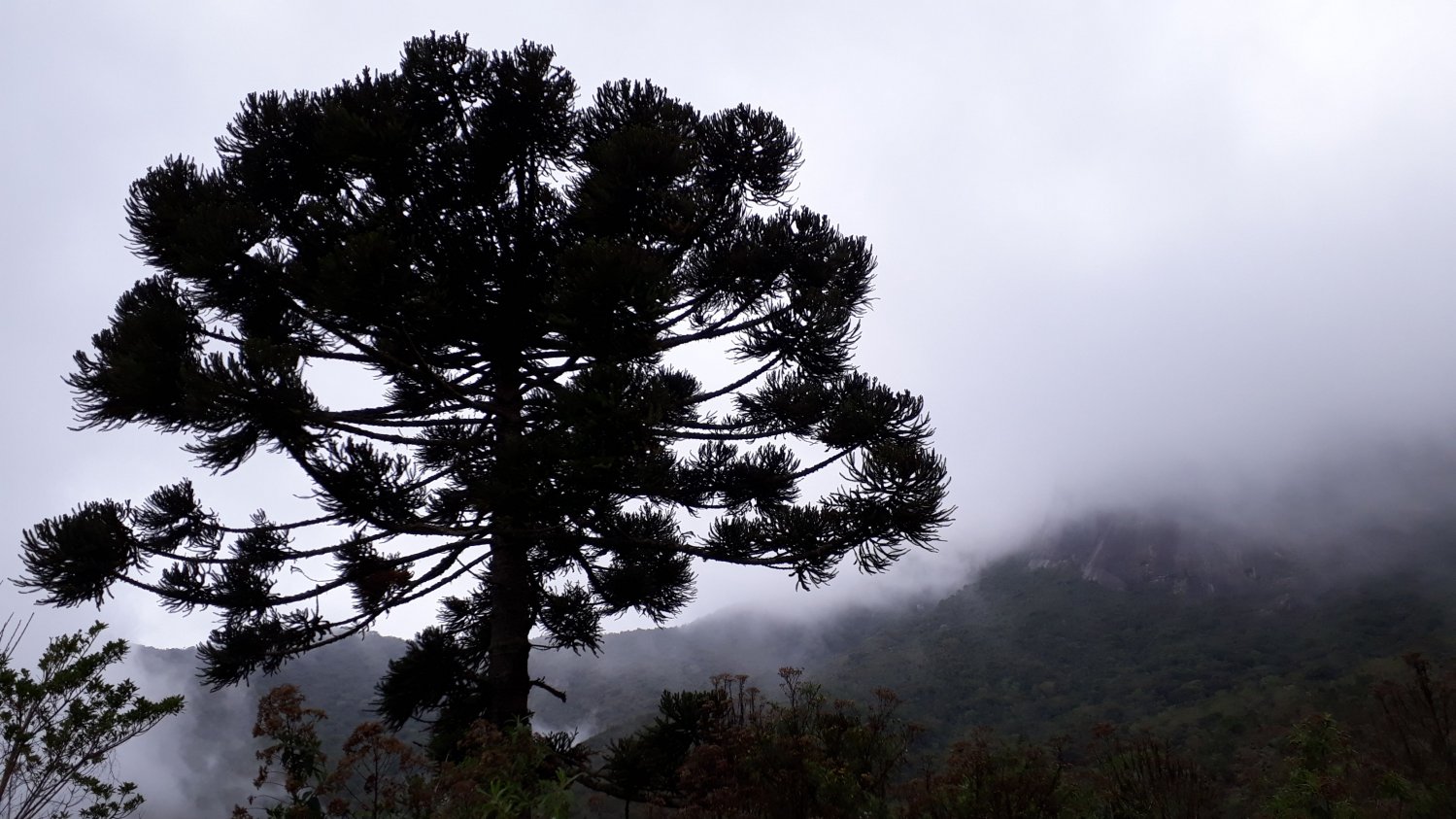 Logo na saída do refúgio algumas situações inusitadas aconteceram. O cachorro do Zezin começou a me seguir, abanando o rabo e parecia que eu teria uma companhia para fazer a trilha. De repente ele solta um choro e volta rapidamente pro refúgio com o rabo entre as pernas. Daí a pouco minha lanterna capta um par de olhos na beira da cerca e quando eu jogo a luz pude perceber a imagem de um felino se abaixando. Não era muito grande mas foi bem assustador. Mais alguns metros e mais um par de olhos acompanhando meu progresso de cima de uma árvore. Tudo bem, era só uma coruja. Mais adiante vejo três pares de olhos na estrada e como eu já imaginava encontrar pelo caminho, eram três bovinos no meio da estrada por onde eu teria que passar. Ficaram parados, olhando atentos. Eu tinha que traçar um plano rapidamente para me livrar deles e tive a ideia de subir no lado mais alto da estrada, atravessar a cerca e ir margeando-a até ter passado por eles. O problema era que havia uns charcos no pasto, mas não tinha outra opção. Só que pra minha surpresa os bovinos começaram a descer a estrada correndo assustados. Aí não tive dúvida, pulei a cerca de volta pra estrada e fui tocando eles, batendo no bastão e gritando até chegar numa bifurcação onde eles seguiram a estrada oposta à que eu deveria seguir. Passado o susto, pude me concentrar na caminhada que já começava a ganhar altitude em direção ao Parque Estadual dos Três Picos. Cheguei na pedra do Sofá, primeiro local de descanso às 3:30 e ali já pude perceber que não chegaria a tempo de ver o sol nascer. Pelo menos não do cume. Mas, por um outro lado, seria bom fazer o último trecho no claro. Assim que a temperatura do corpo começou a cair, me preparei novamente e retomei a caminhada. Cheguei ao Vale dos Deuses e resolvi comer uma banana, já que dali seria uma tocada, de 1:30 até o cume. E as 5 horas da manhã, consegui chegar até um mirante onde dali já seria possível contemplar o nascer do sol. Só que estava completamente fechado o tempo. Meu campo de visão não alcançava além do que 10 metros. Já começava a clarear e percebi que meu senso de orientação estava perdido. Se eu subia de costas pros três picos o cume deveria ficar à minha esquerda mas o GPS apontava pra direita. Fiquei sem entender muito mas segui o aparelho que realmente estava certo. Pelo visto o acesso a parte rochosa da montanha se dá pela sua face leste. Em algum momento a trilha na mata cruza de um lado pro outro. O trecho final foi dentro de muita cerração, e fiquei bastante apreensivo mas continuei, uma vez que tinha um GPS, pilhas, e na pior das hipóteses poderia acionar o SOS do meu SPOT.