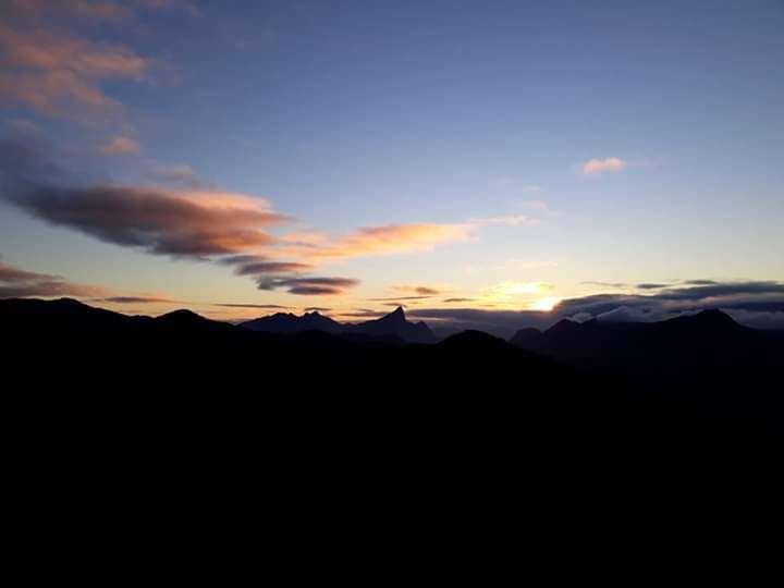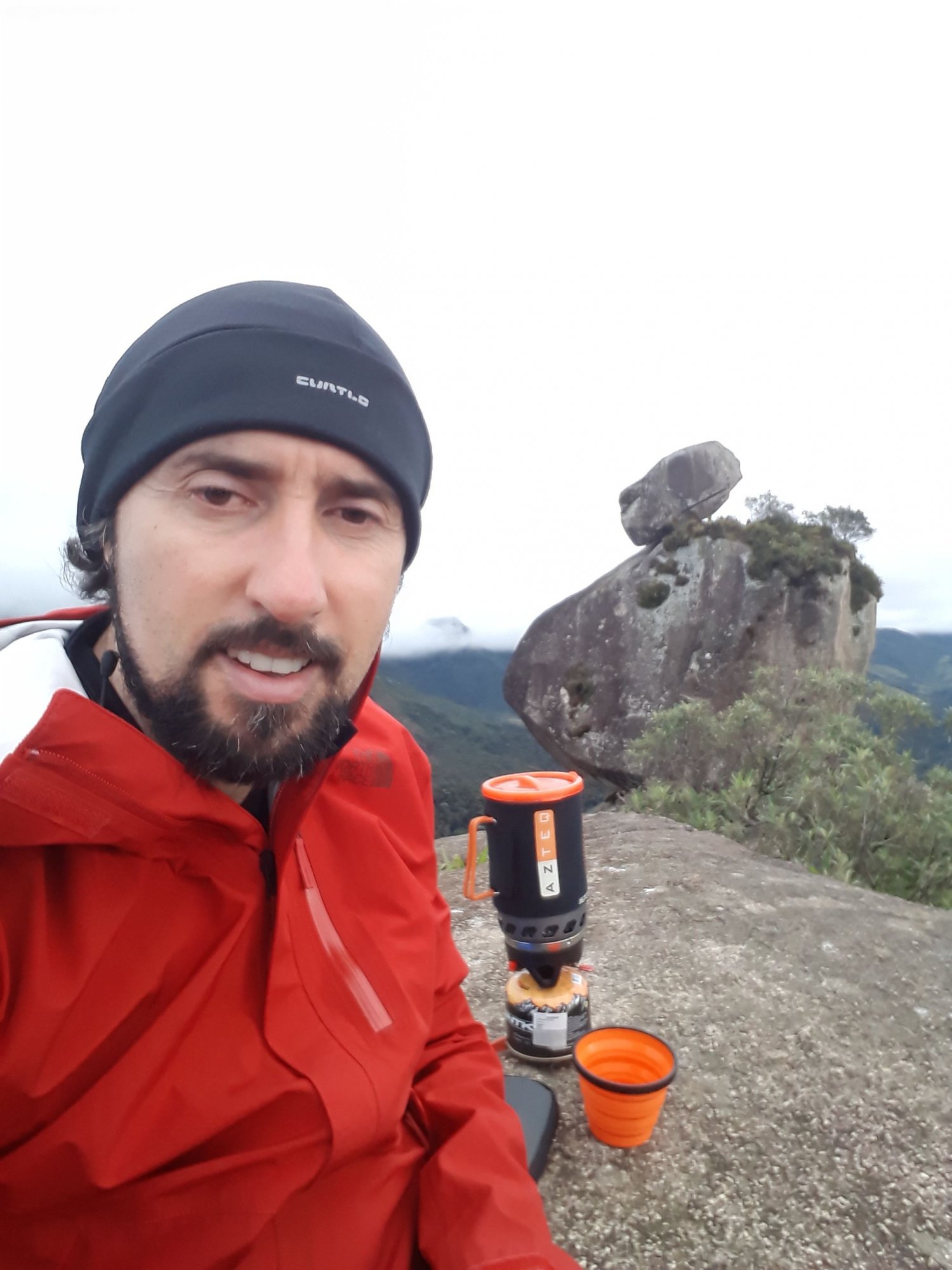 Minha penúltima ascensão lá no Peito foi com uns amigos e meu irmão. Fizemos em julho de 2019. Fomos em dois grupos separados. Meu irmão com três amigos num grupo que partiu 1 hora na nossa frente e eu, um amigo e mais dois casais. Eu levei o fogareiro e fizemos um delicioso capuccino lá em cima. O sol nasceu entre nuvens e ventava bastante.