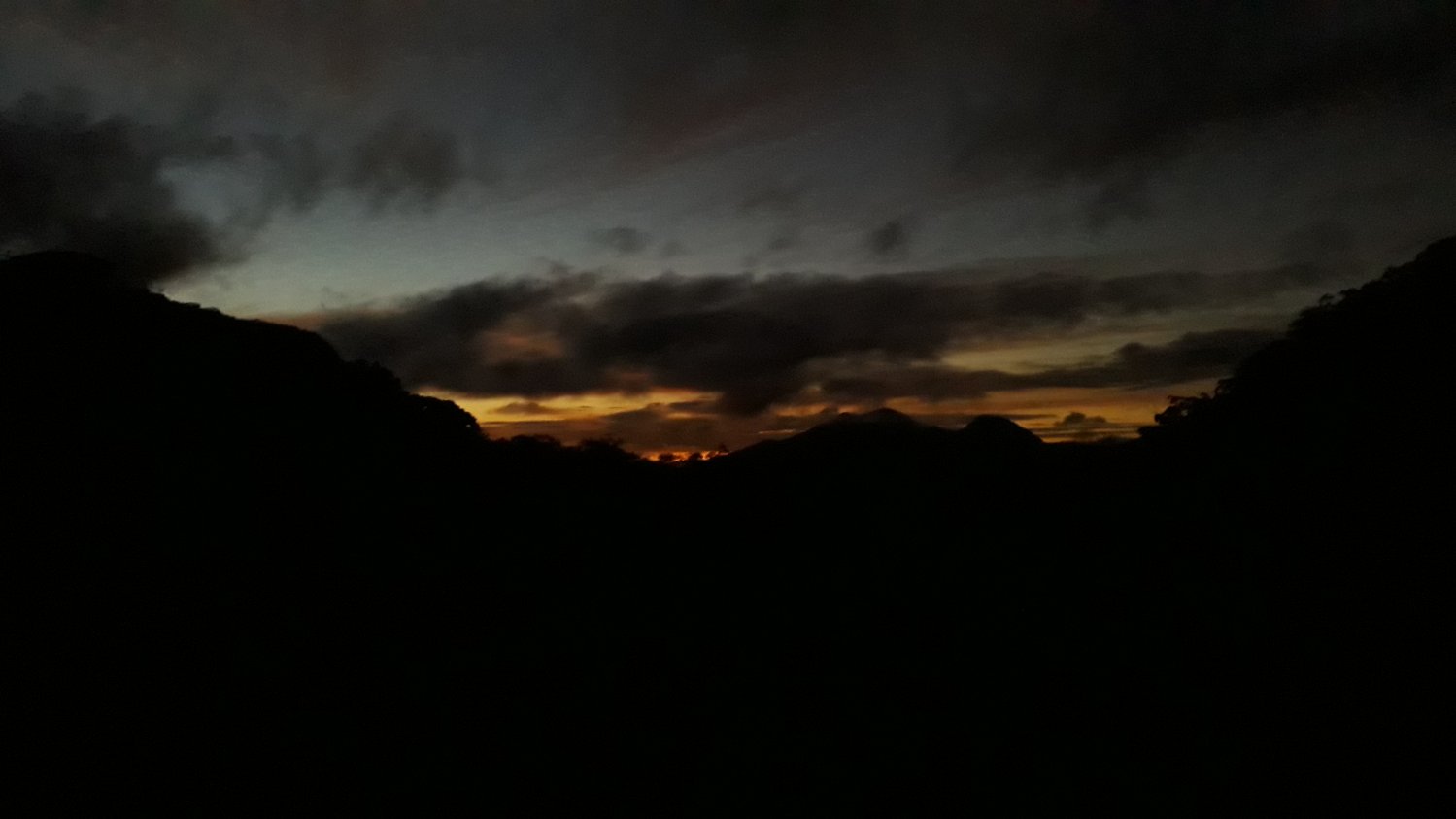 Comecei a caminhada às 1:30, um pouco mais tarde do que havia planejado, uma vez que geralmente se leva 4 horas pra chegar lá em cima, e o sol nasceria às 5:15. Logo nos primeiros minutos de caminhada começou a choviscar mas nada que não desse pra suportar. É claro que acende uma luz de alerta mas resolvi avaliar a situação quando chegasse na área descampada antes da travessia do rio. Quando cheguei nesse local a chuva deu uma trégua e consegui chegar no rio, sem maiores problemas. Atravessei pra outra margem e resolvi fazer uma parada de descanso. Nesse momento é que cometi um erro na trilha e ao invés de atravessar a cerca segui pela trilha que a margeia. Daí o GPS avisou e rapidamente concertei meu curso. No pasto minha maior preocupação era encontrar algum bovino e eu ia iluminando todo o pasto pra me certificar da provável presença de algum. Acontece que de repente baixou a maior serração, e meu campo de visão se limitou a poucos metros. Nesse momento hesitei em prosseguir. Mas não podia desistir assim tão fácil, embora estivesse sentindo muito a parte física. Fiz aquele trato mental que se ao chegar na trilha de mata fechada o tempo permanecesse fechado, eu daria meia volta sem pestanejar. Eis que alguns minutos depois surgem várias estrelas no céu e começa a despontar um vermelhidão no horizonte.