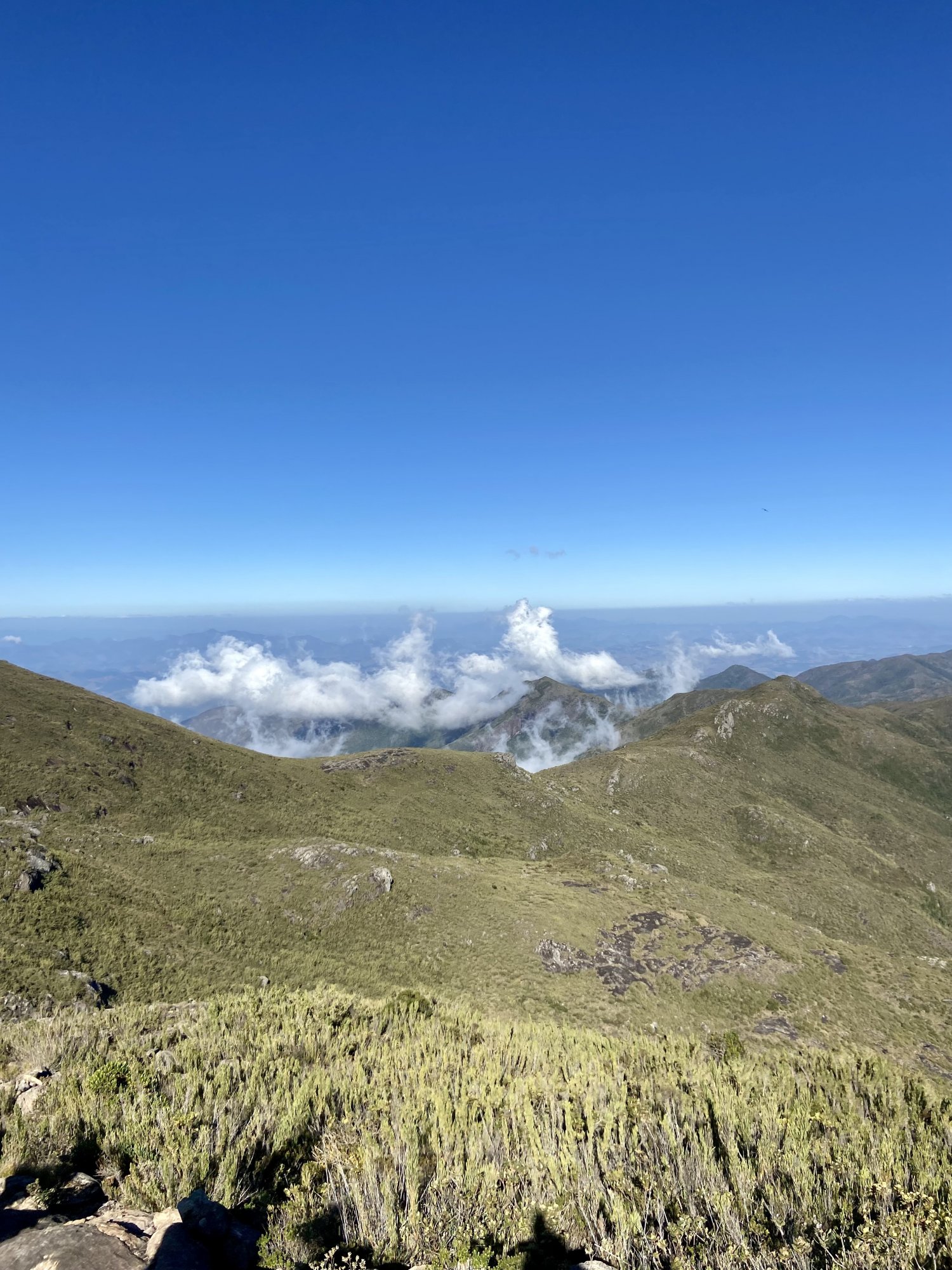 O caminho de volta entre Cristal e Calçado ainda encantava pelas paisagens do Caparaó, mas confesso que, passado a euforia de ter feito os três cumes, foi um pouco mais tedioso chegar ao Calçado novamente, sobretudo se contar que aquela decida que falei que era apimentada, agora virou uma subida. 15:10 estávamos no alto do Calçado reencontrando com o restante do grupo. Já 15:30, indo em direção à bifurcação da trilha com o Bandeira presenciei uma formação de nuvens bem interessante