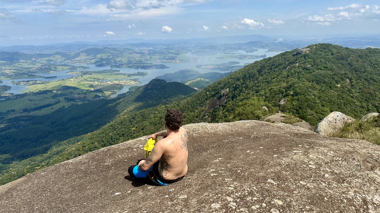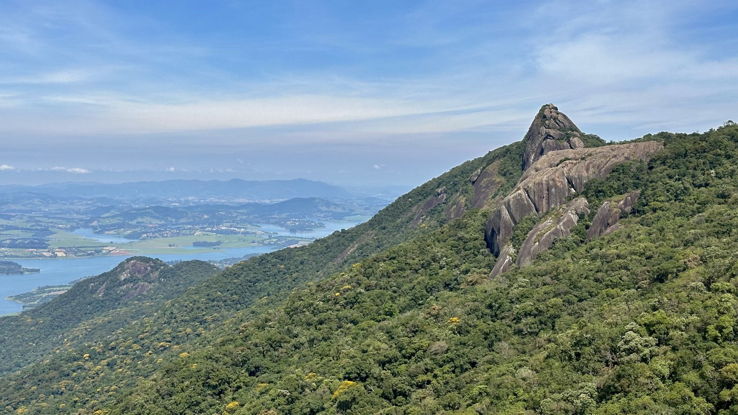 Mesmo em ritmo moderado, nem 30 minutos separam o primeiro mirante da Pedra dos Cabritos. Lá a vista é mais panorâmica, tem um pouco mais de altitude e o Pico do Lopo aparece mais próximo. Bonita a vista para a represa.