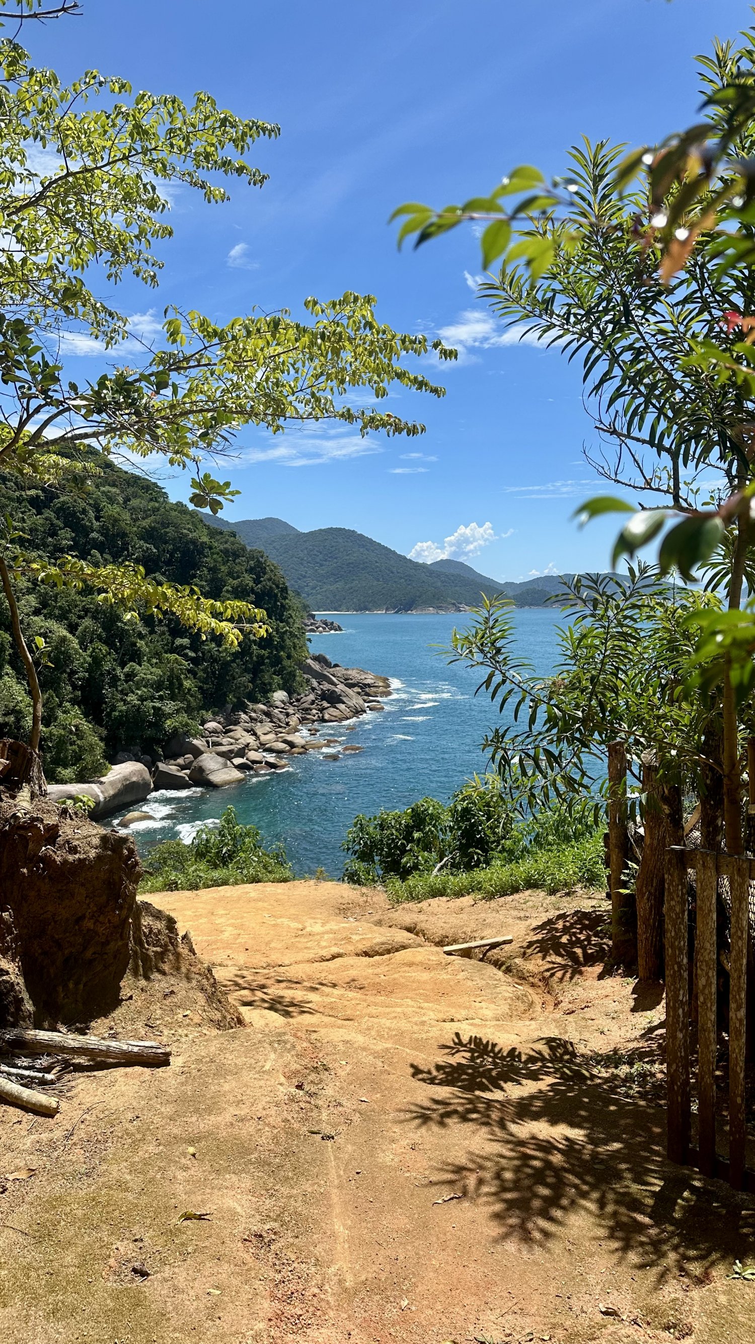 Da Praia do Cruzeiro foi uma passada rápida na Praia do Crepúsculo e seguindo direto (entre trilhas e casarões particulares) para a Praia do Engenho. Apesar do trecho final ter sofrido uns deslizamentos de terra e da recomendação para pegar um barco ao atravessar esse trecho (fevereiro/2024), não vi nenhuma dificuldade a mais na trilha e fomos por terra mesmo. Nesse ponto o calor era tanto que dava para tirar a camiseta e torcer de tanto suor que tinha. Pontos de água estão sempre presente, mas é um trecho sem sombra nenhuma e cheio de descidas e subidas. Na Praia do Engenho dava para curtir um pouco o mar, almoçar, abastecer com água gelada, deitar debaixo de uma árvore e relaxar um pouco. E depois disso a felicidade toda se esvaziou dos olhos...