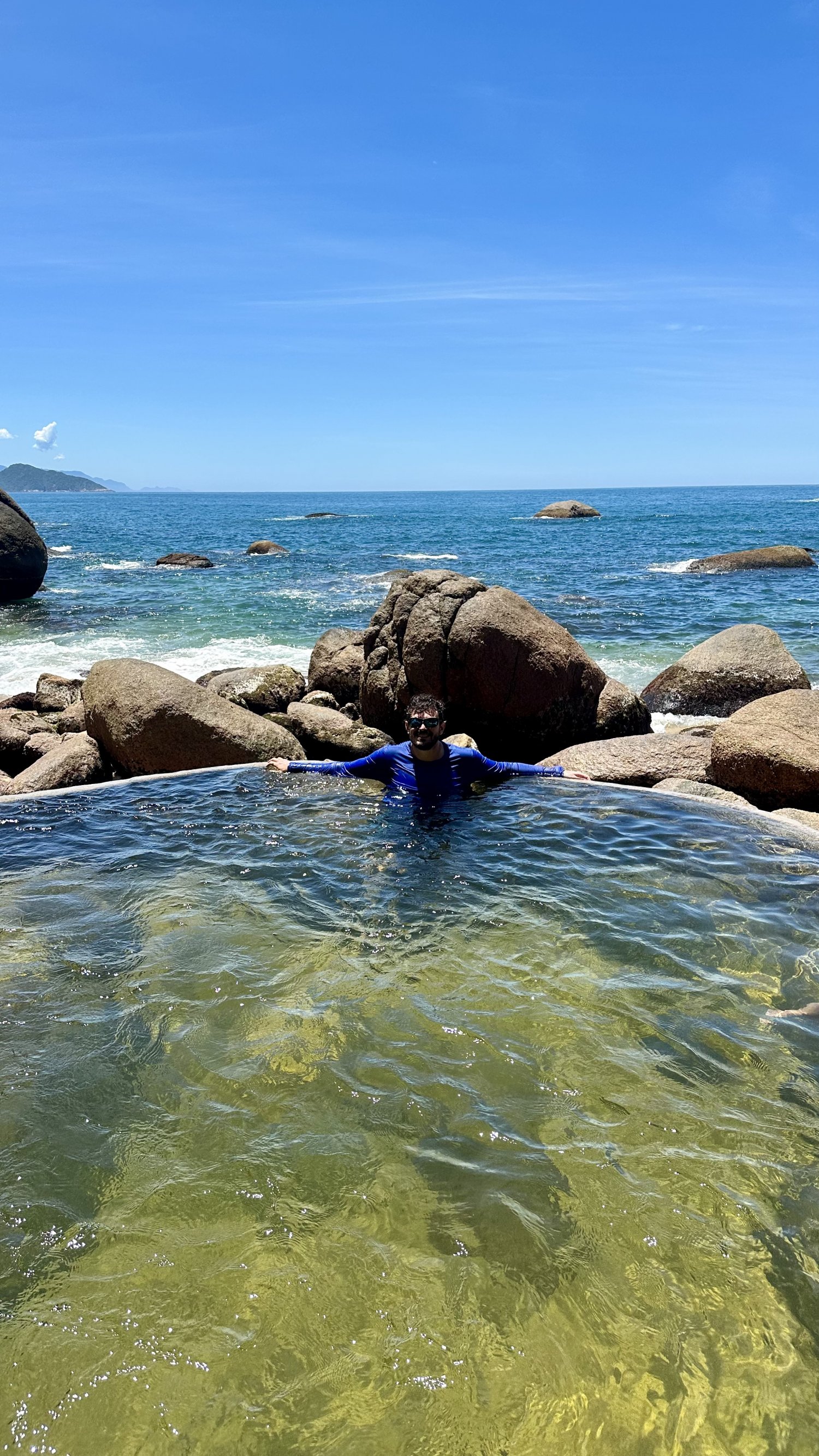 A minha intenção era parar rapidinho para um lanche e nem esfriar as pernas antes da subida rumo à Ponta Negra, mas, cara... Cairuçu das Pedras simplesmente roubou o meu coração. Que praia fenomenal! A água de perto transparente, de longe um azul que da gosto. Cabeça ia longe vendo as ondas que batiam nas pedras. E na beira da água, uma piscina natural desaguando no mar. Era uma falta de educação simplesmente ir embora sem ficar um tempo lá (e até me arrependi de não tem programado o camping naquela praia). O que era para ser 15 minutos de parada se extendeu por 1 hora e meia e ainda meio se vontade de ir embora, em parte devido a Cairuçu, em outra parte devido ao desafio que viria pela frente.