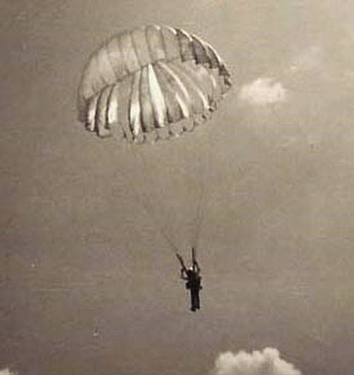 Olhei para cima e vi o velame aberto. Lá estava eu pendurado sob um velame redondo de cor branca, laranja e marrom. O silêncio era total. Diferente dos aerofólios de hoje que tremulam e fazem barulho. A 2.000 pés eu podia avistar nitidamente o alvo onde pousaria e o meu instrutor Miro no centro dele. Eu tive um pensamento de vitória: consegui, agora não dá mais pra voltar para o avião, portanto esse salto já é meu.