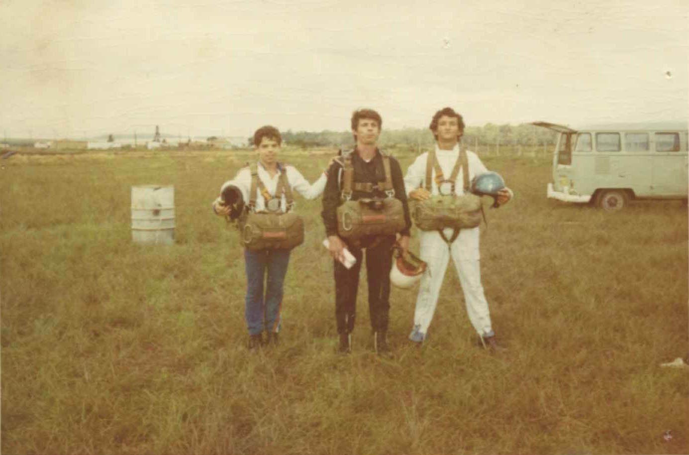 O equipamento era semi-automático com fita de abertura e reserva ventral. Se eu tivesse uma pane não teria como desconectar e teria que abrir manualmente o reserva que ficava na frente. Nos primeiros saltos não usávamos altímetros e nem óculos, apenas um capacete.