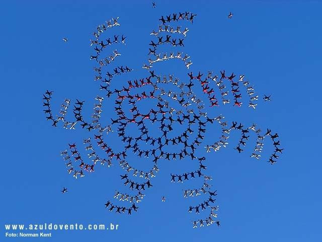 Entrei na formação e percebi que havia uma pequena onda se formando no lado esquerdo, no setor vermelho. Aqueles segundos de queda-livre se passaram lentamente. Sacudi a cabeça para autorizar a entrada dos wackers, pois a minha função era de âncora, ou seja, o ponto de ligação da base com as linhas que entravam por último na formação. Apesar do salto estar bastante estável, não podíamos descuidar. O recorde tinha que sair e tinha que ser nesse salto.