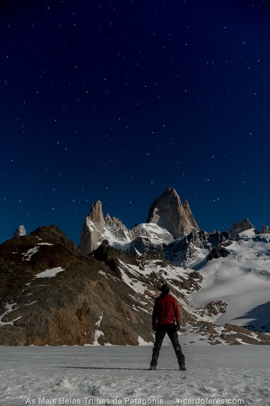 Sobre a Laguna de los Tres congelada, iluminado pelo luar.