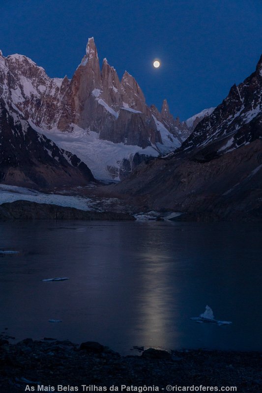Em vez de acordar pra ver o sol nascer, resolvi ir durante a noite pra poder fotografar sob a luz da lua cheia. Não vou dizer que é agradável sair da barraca no meio da noite e passar horas a 4 graus negativos, mas valeu cada segundo, foi bom demais estar na beira da laguna sozinho, com a lua iluminando as montanhas e sem ouvir qualquer barulho que não fosse da minha respiração.