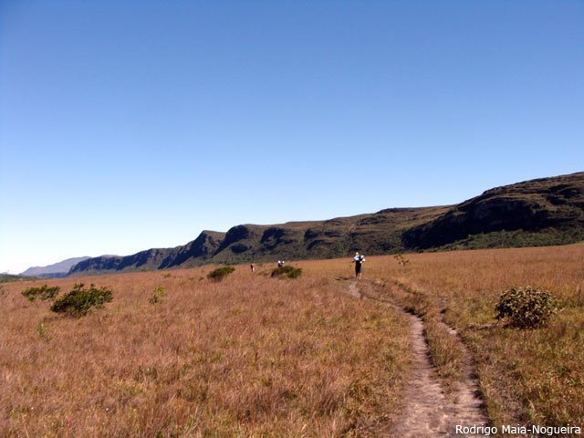 Chegando no topo aquele campo enorme de um capim seco, dourado com montanha de um lado, montanhado outro e montanha ao fundo ... e no meio o que parecia ser um pásis, um pequeno fragmento florestal chamado de rancho, para onde seguimos.
