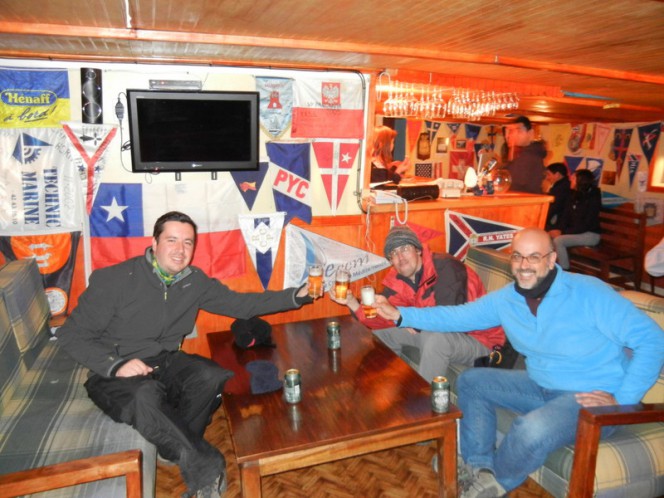 Terminado o jantar, fomos aos Carabineiros para nos registrar para o Trekking. Lá você informa seus dados, passaporte, a data de ida e volta da caminhada. Além disso, ainda eu tinha mais um objetivo em Williams, o qual era conhecer o Micalvi Yatchi Club. Este lugar é sensacional, é um bar-barco onde claro, tomamos mais umas Austral e apreciamos o lugar. Viajantes do mundo inteiro, inclusive Amyr Klink, decoram o local com flâmulas de seus respectivos barcos, expedições ou países. Valeu muito a pena a visita.