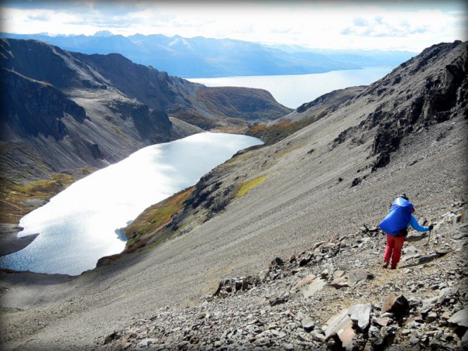 Sempre acompanhando a Laguna Del Robalo à direita e o pico de Los Dientes à frente. Sempre na encosta, Chegamos até a Laguna Del Salto e descemos a pirambeira com o máximo de cuidado. O local foi excelente para acampar, pouco vento, bem protegido e água e muito visual.