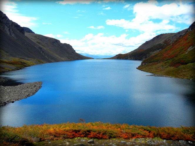 Adentramos em um trecho de bosque colorido e vimos a Laguna de Los Dientes, por difícil decisão elegemos este lugar o mais lindo de toda a travessia. Descansamos por um bom tempo lá até retomar a caminhada por um bosque (trecho confuso, quase não há marcações), pois tínhamos que descer ao nível da lagoa e contornar o Cerro Gabriel e enfim chegar à Laguna Escondida.