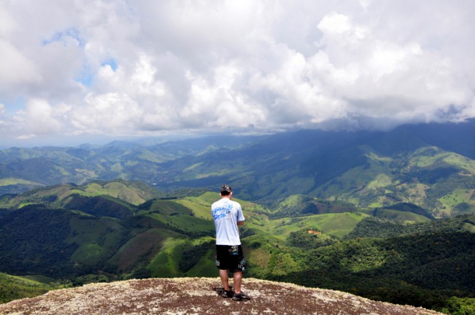 O papo foi interrompido pelas nuvens cinzentas que tomavam o céu e imaginando que a descida seria difícil sem chuva, imagina com esses pés d’água que tem caído ultimamente. Prontamente voltamos à trilha, escalamos o trecho da “corda” e continuamos a caminhada. No trecho mais íngreme de descida, vários tombos e ralados, mas nada mais grave. Só paramos no trecho de água para matarmos a sede e beliscarmos alguma comida, pois já sonhávamos com a comida mineira que o Ronald falara que havia em São Francisco Xavier.