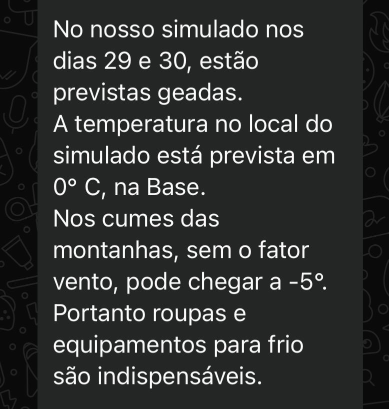 Tendo saído de SP desinformado sobre como transcorreria a etapa do simulado, como estratégia do treinamento, tratei de dispor de equipamento completo para um pernoite autônomo, sob gélidas temperaturas de um fim de semana chuvoso na imensidão de uma serra qualquer no Paraná. Difícil projetar cenário mais agreste que essas plagas, com a visibilidade realmente nula, temperaturas reais negativas e intensos ventos que derrubam a sensação térmica a patamares bem inferiores a 0ºC. A somarse nesse quadro hostil, não é raro que a chuva, com maior ou menor intensidade esteja presente. Frio molhado e ventoso, condição não rara de ocorrência nessas regiões é uma combinação das mais problemáticas quanto ao risco de hipotermia. Para suportar essa má condição, meus equipamentos contavam com jaqueta de pluma, uma segunda pele técnica, mais “quente”, separada para pronto emprego. Duas capas de chuvas descartáveis, poncho de emergência. Os equipamentos de dormir estavam protegidos por 3 camadas plásticas. A jaqueta de pluma, idem. A segunda pele para pronto emprego, apenas uma camada, pois ainda se mostra funcional úmida. O curso iniciou-se com uma rápida apresentação do CPM, da estrutura de apoio, do instrutor (Máfia), seguida da apresentação individual dos alunos. Minha impressão da seriedade da proposta já era positiva, ao conhecer meus colegas de treinamento apresentação, fiquei ainda mais confiante quanto à qualidade da formação que receberia.