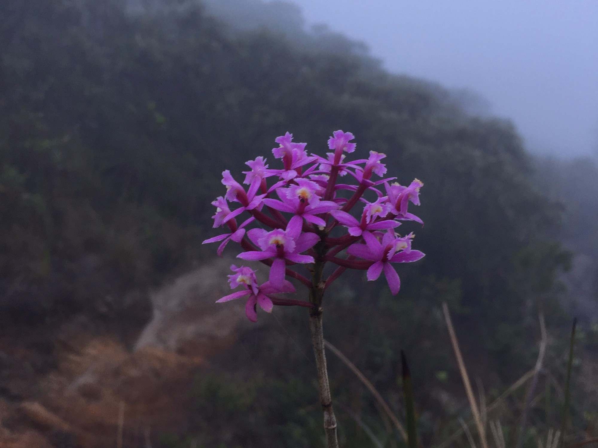 Procurando sair da região mais exposta ao sol e lembrando que haviam dito ter previsão de chuvas a partir das 10h, fizemos uma parada curta, reabastecendo minhas garrafas d’água e as do Rodrigo e tocamos para baixo, ansiosos por encontrar a Panela Vermelha, nosso próximo referencial. Esse trecho não conta com descidas muito íngremes, mas a extensão e a pouca variação de paisagem fazem com que se perceba ele como “muito longo”. Como sempre, eu desci dividindo a atenção entre olhar o caminho e procurar orquídeas. Encontrei poucas floridas, mesmo assim a procura cumpriu o papel de distração. Alcançamos a clareira da Panela Vermelha, viramos à esquerda e seguimos em busca dos dois cursos d’água que marcam o final da descida constante. Chegamos no primeiro deles, acumulando 4 h de descida, fizemos uma rápida parada para nos agruparmos e hidratarmos e tocamos em frente.