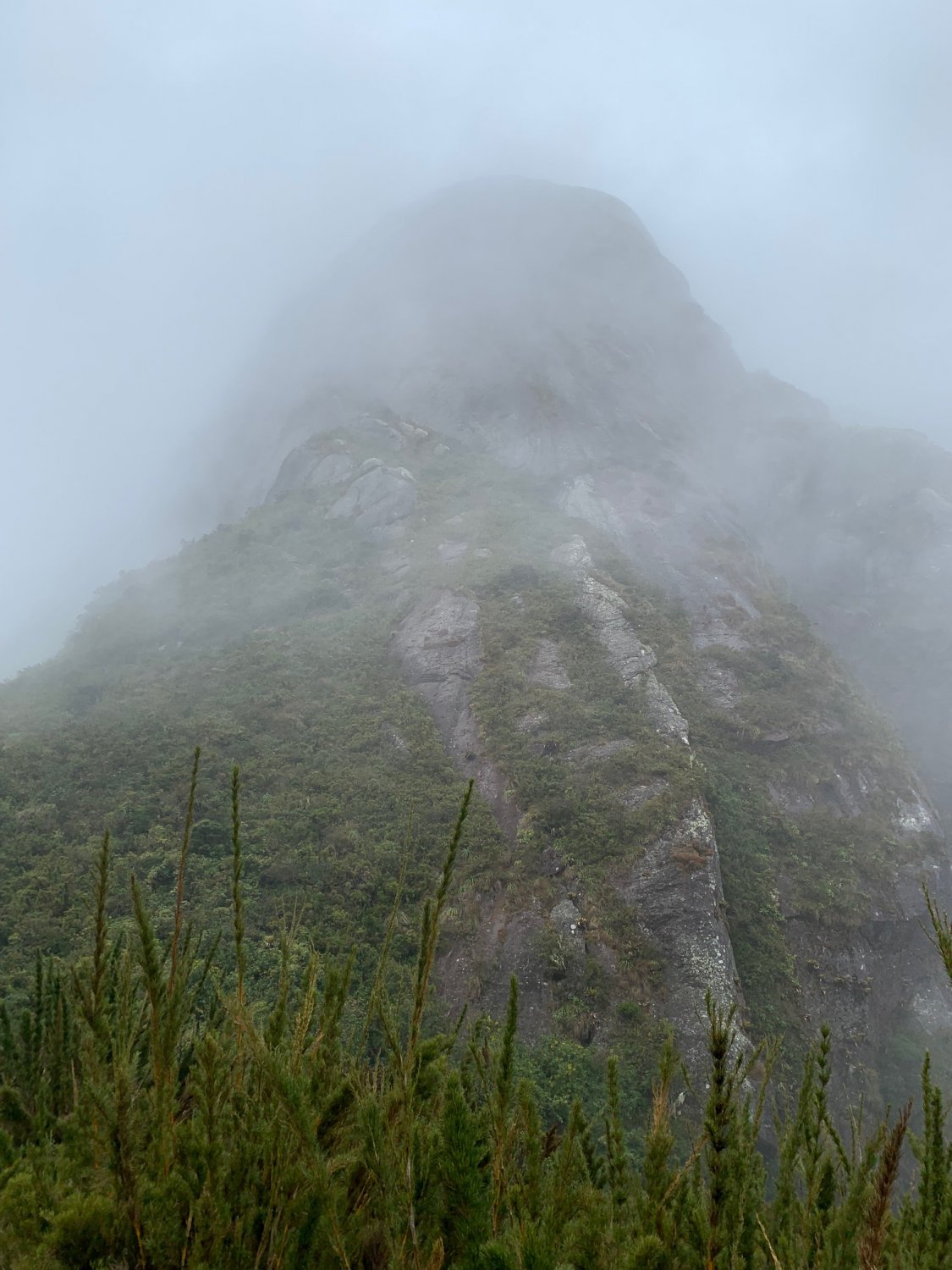 De volta ao acampamento, enquanto a Paula preparava o café da manhã, desmontei o acampamento e arrumei as cargueiras, redistribuindo as tralhas de camping, roupas e mantimentos. O café da manhã esteve à altura da Cheff, com crepioca de 3 queijos e brie com geleia de amora silvestre da Serra Fina. Pouco antes das 8:00 partimos em direção ao MORRO DO MARCO, totalmente oculto pelas nuvens que se fechavam pouco a pouco. Havia horas em que caminhávamos DENTRO das nuvens, com o vento trazendo as pequenas gotículas que as compõem de encontro aos nossos corpos. Tudo se apresentava fantasmagórico, com uma montanha surgindo diante dos nossos olhos em segundos e se ocultando da mesma forma. Nesse ambiente, extremamente húmido, e felizmente, não congelante como algumas previsões vaticinavam, a navegação visual fica muito, se não totalmente comprometida. Sabedor disso, eu havia feito com que fossemos um dos primeiros grupos a partir, de forma a termos o som dos demais grupos como referência, caso se fizesse necessário. Permiti que a Diva de Ébano seguisse à frente, buscando a trilha nos totens que surgiam e sumiam, nas marcas de passagem e no rumo esperado (para cima, sempre, até encontrar alguma marcação que aponte outra direção). Foi bonito de ver, segunda vez na montanha e ainda assim, conseguindo intuir, quase sempre corretamente, por onde ir.