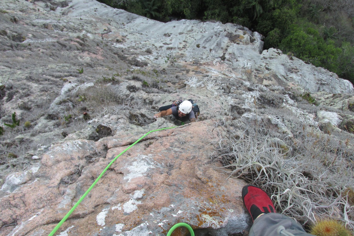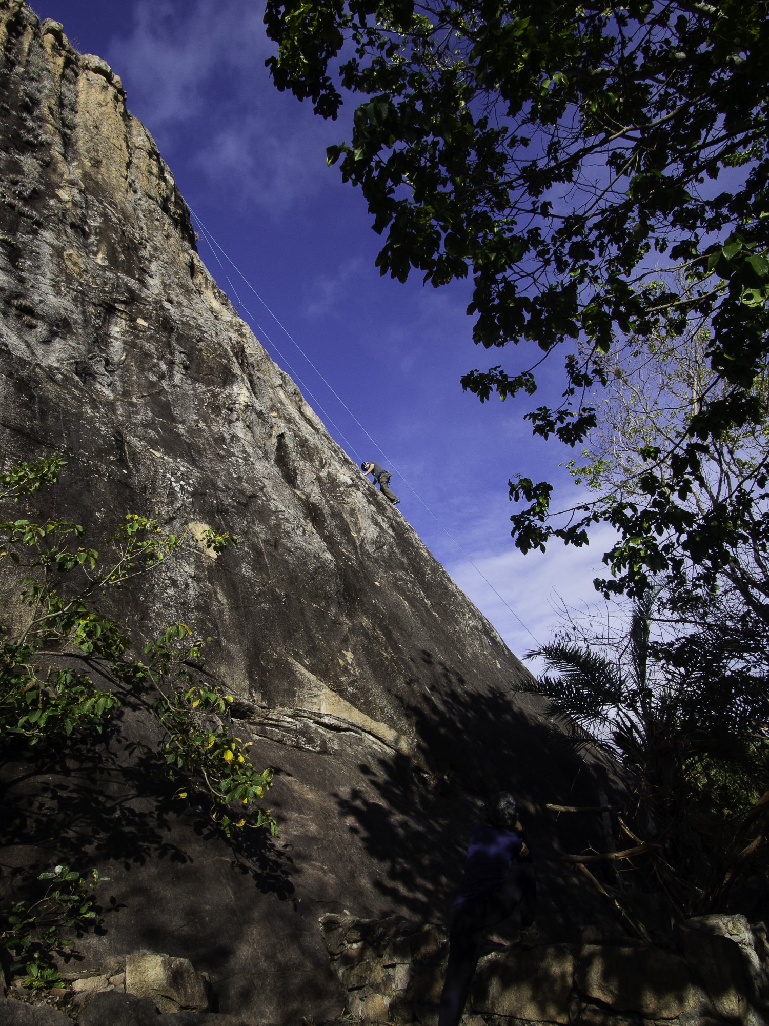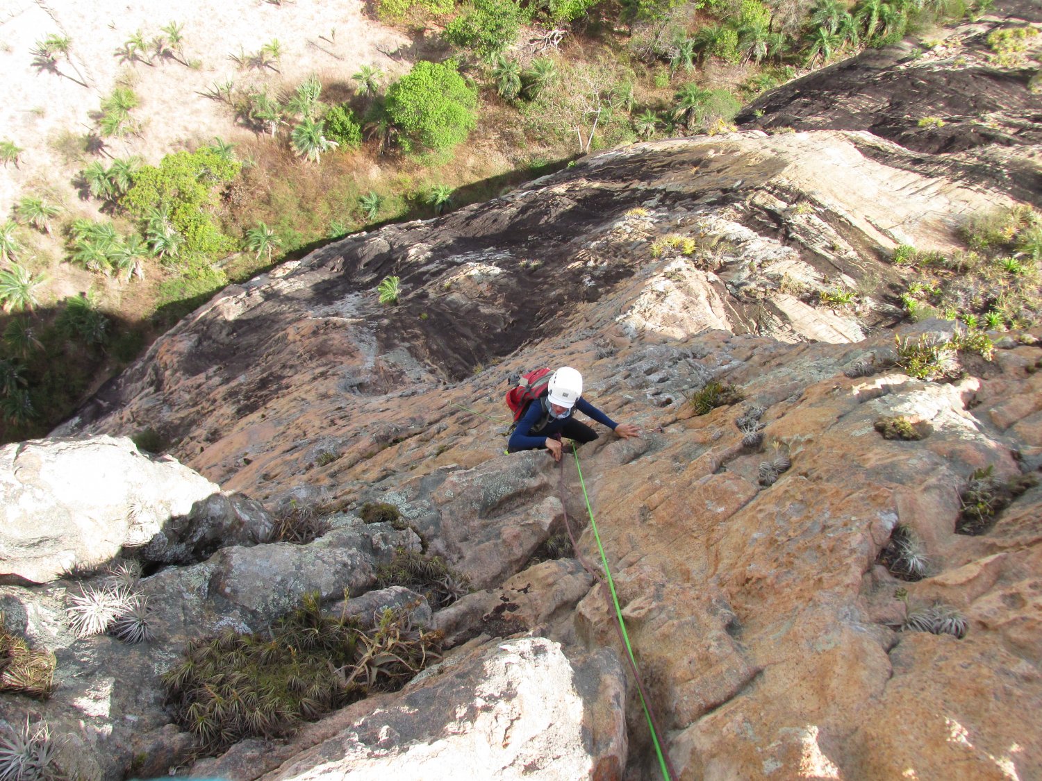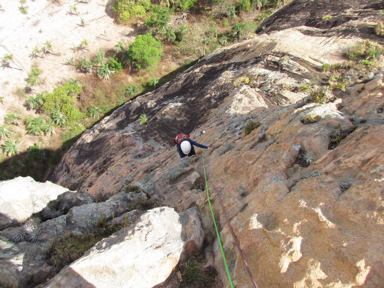 Após o almoço, seguimos com a aula sobre equipamentos e sua utilização e a tarde fomos para a primeira aula na rocha. A aula foi numa via esportiva de 4º grau chamada “Maria Mole”, que já conhecíamos e já havíamos escalado. A aula foi sobre segurança e foi uma delícia escalar e fazer segurança, aclimatando à rocha após um par de semanas relegados apenas à resina das poucas agarras existentes na precária parede de escalada da capital baiana. Peter, que havia saído para uma pernada pela Serra que circunda Itatim, nos encontrou aos pés da “Maria” e acompanhou nosso processo de aprendizado. O que nos leva a um apêndice nessa história, que você pode conferir logo abaixo, escrito pelo próprio Peter.