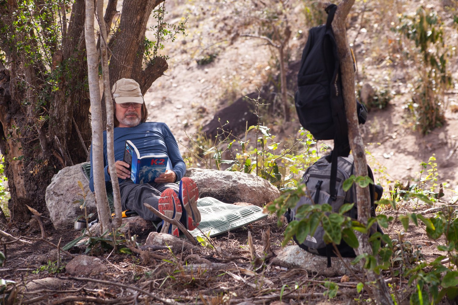 Peter Tofte, lendo sobre escalada enquanto Sandra e Cauí subiam o Enxadão.