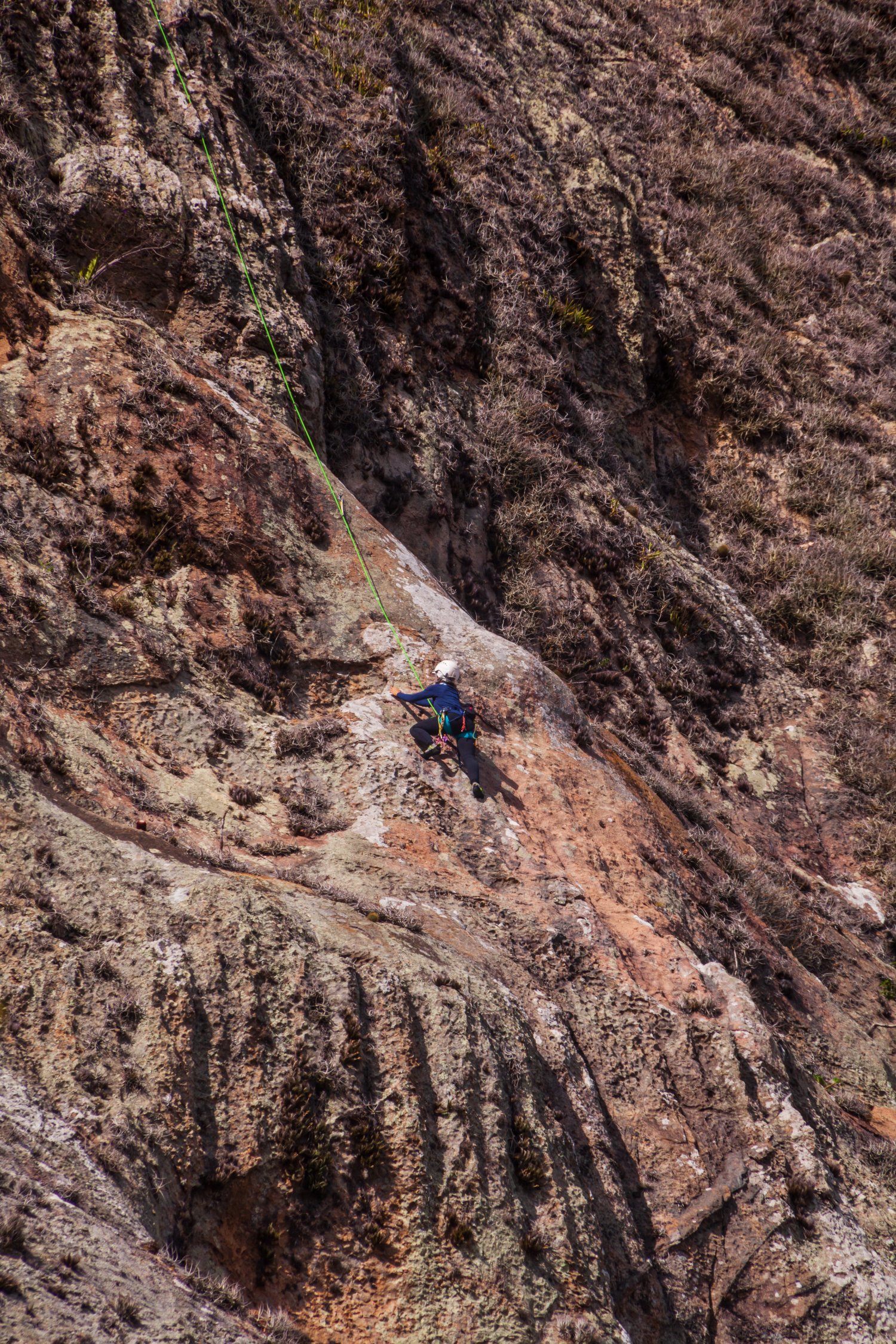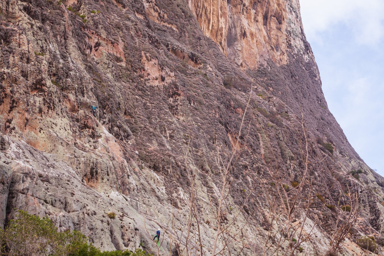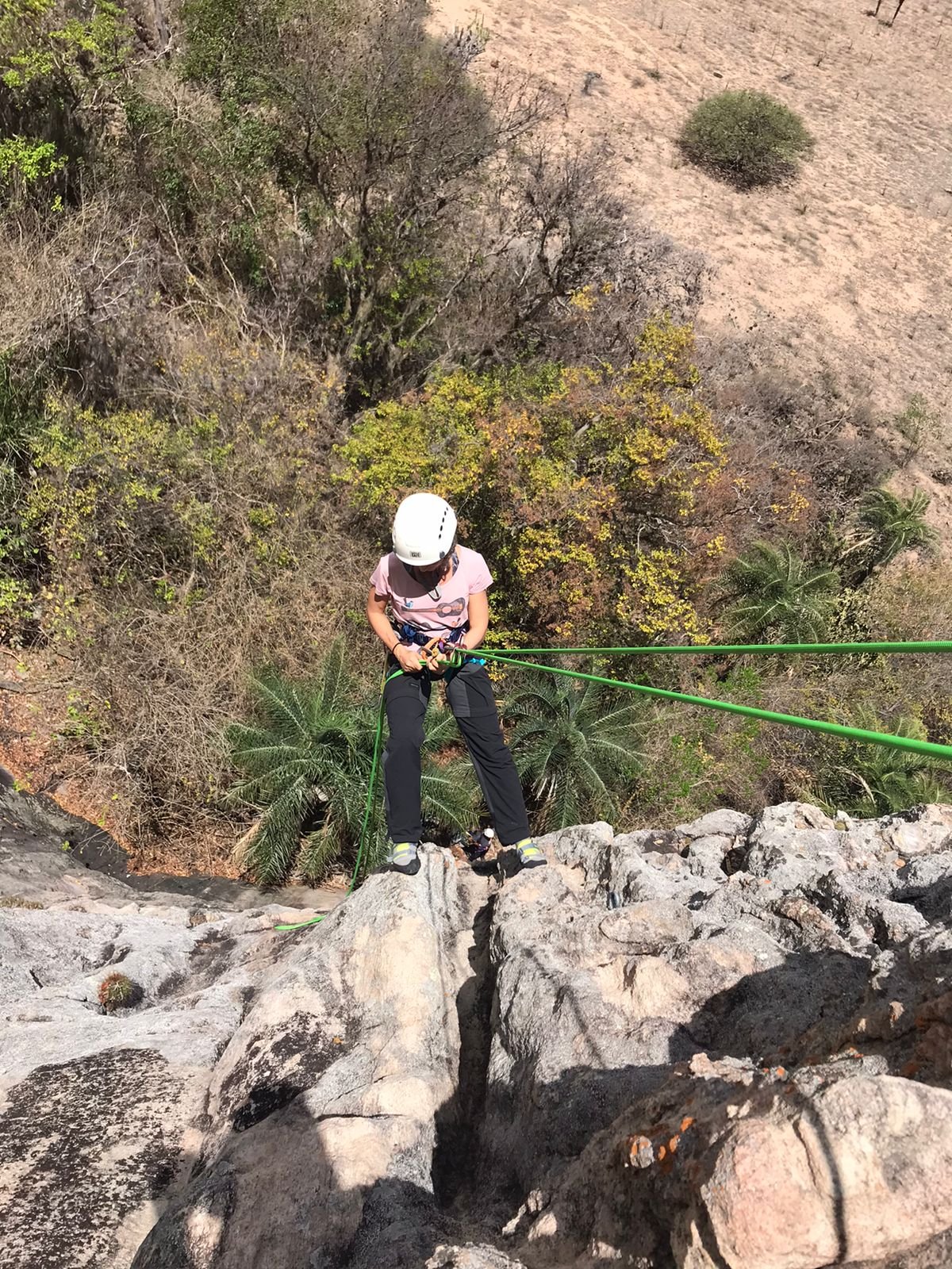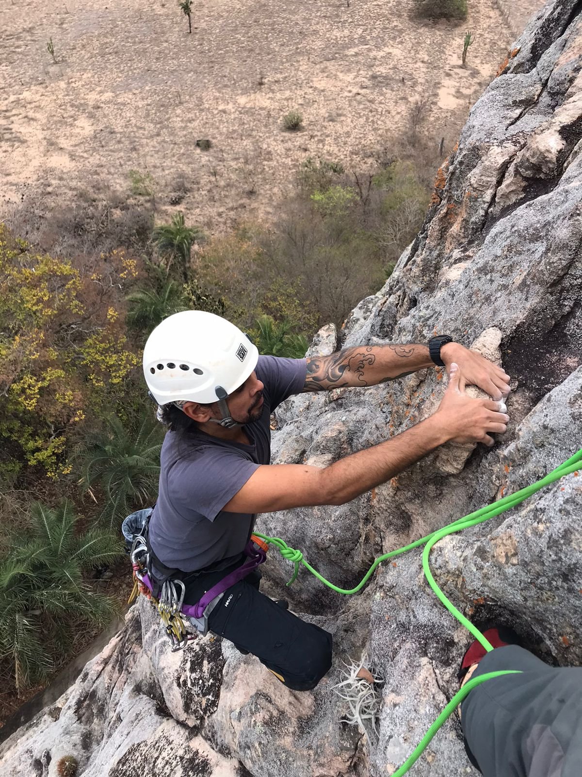 Inicialmente um pouco nervoso, pois nunca tinha encarado nenhuma via com mais de 30-35 metros, entrei na parede seguindo a guiada dele. Fui me acalmando e rapidamente entrei naquele estado de meditação que tanto me atraiu na escalada, quando você se torna apenas um com a rocha, com o vento, os cactos, a vista e a altura, que pensei que poderia ser um problema, passava a ser apenas mais um fator.