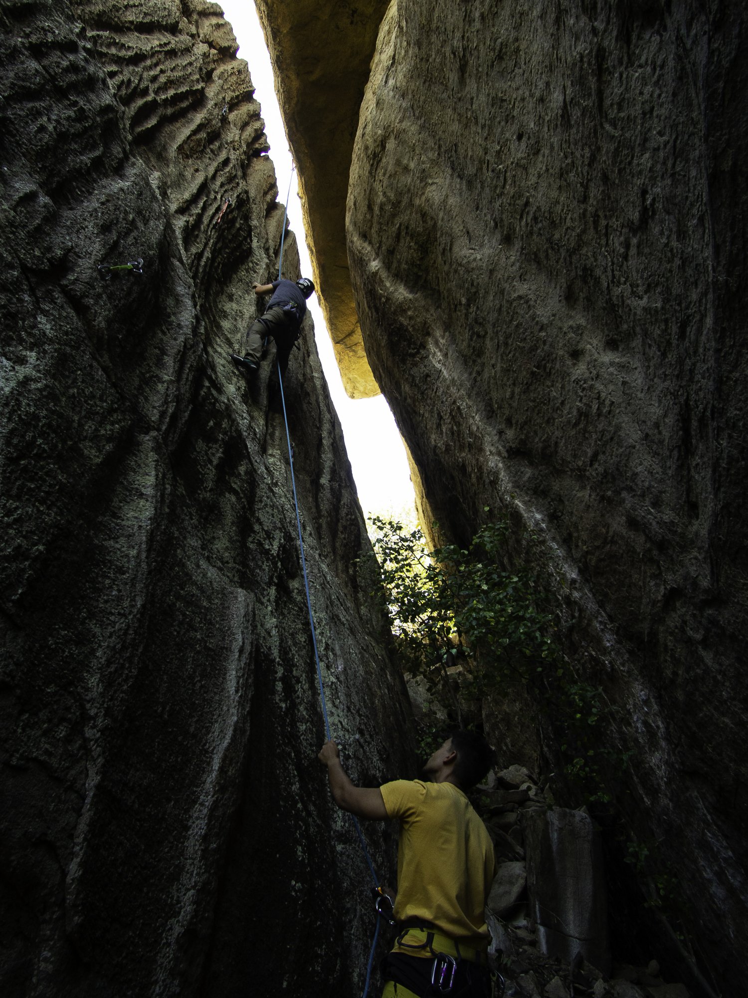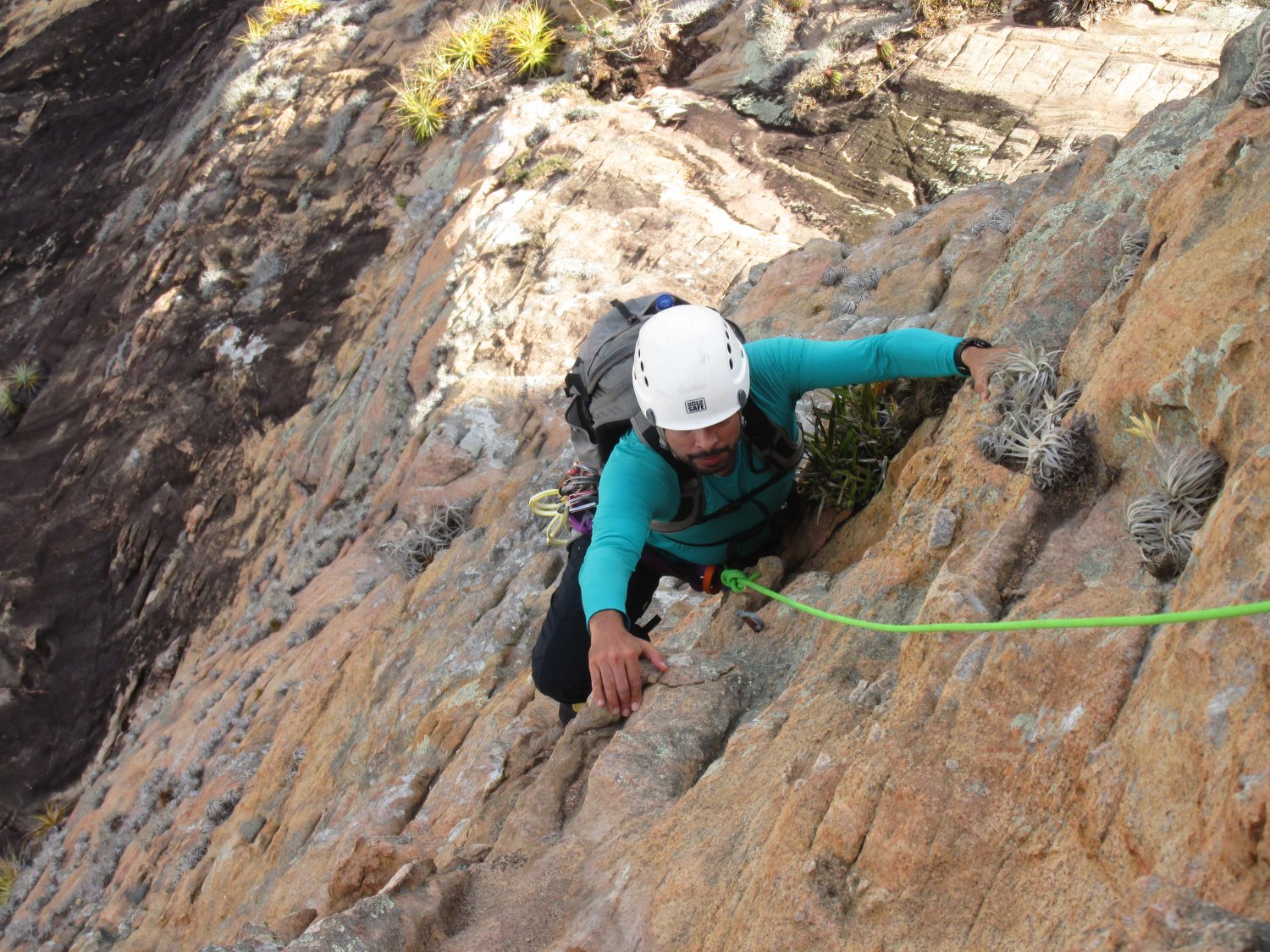 Eu e Sandra trocamos de lugar. Eu assumi o segundo posto e ela ficou para limpar a última enfiada da via, recolhendo as costuras e proteções. Me aproximei da chaminé e depois de uma avaliação, observando uma maneira de seguir, ouvi umas (raras) dicas do instrutor e com um pouco de esforço passei pelo trecho. Agora, esperávamos Sandra, para avançar nos últimos passos para o cume verdadeiro.