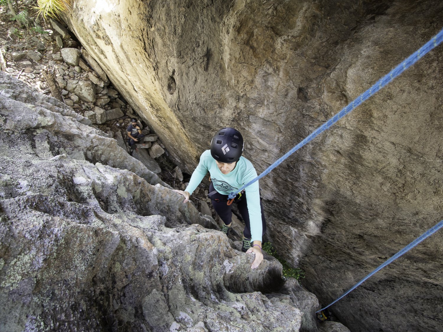 Cauí acima, assegurando Sandra enquanto ela escala.