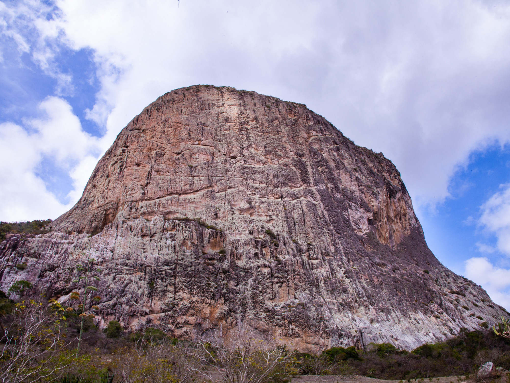 Acionei meu Spot X e parti às 8 horas. Após percorrer uma estrada de terra por 20 minutos cheguei ao começo da trilha, indicado por uma seta. Subida de morro entre a vegetação típica de caatinga e com muitas bromélias. Reparei que todas estavam com água acumulada nas folhas. Me arrependi de não ter levado na pochete um canudinho, que me permitiria chupar água de lá em caso de emergência (deve ser feito com cuidado pois cada bromélia é um pequeno ecossistema com fauna associada).