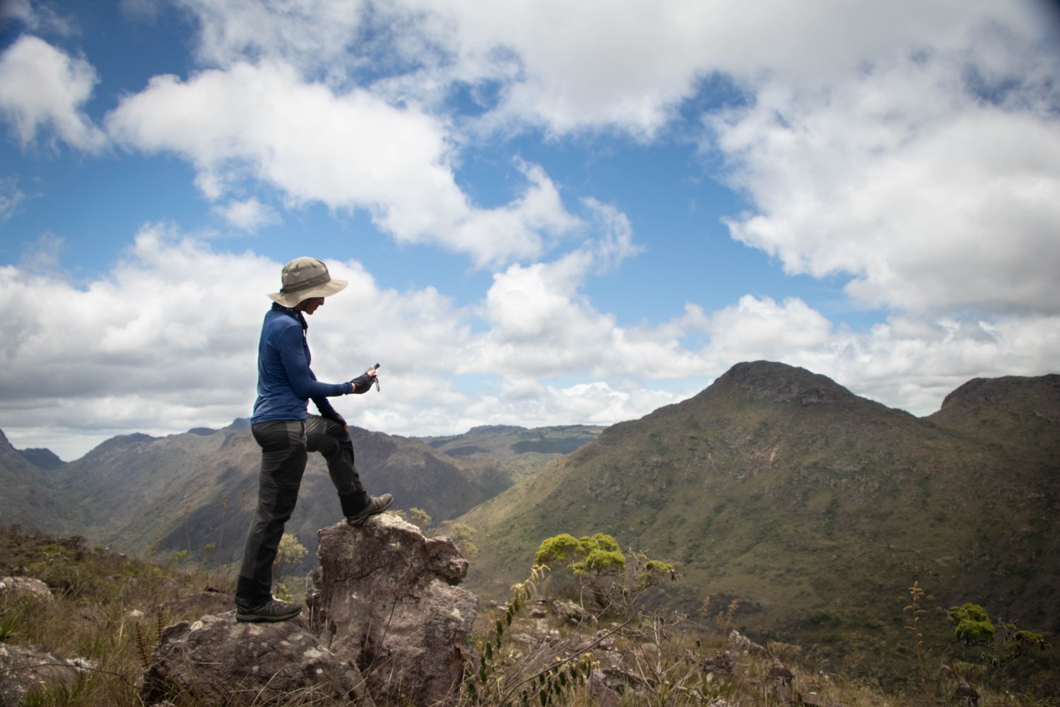 Abaixo, Sandra, com o GPS na Serra dos Cristais. O Vale do Rio Água Suja, à sua frente, abaixo. (Foto de Cris, da expedição do início de 2021)
