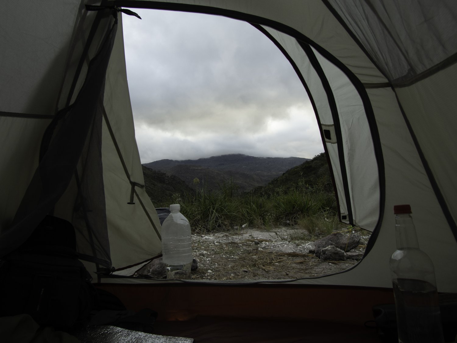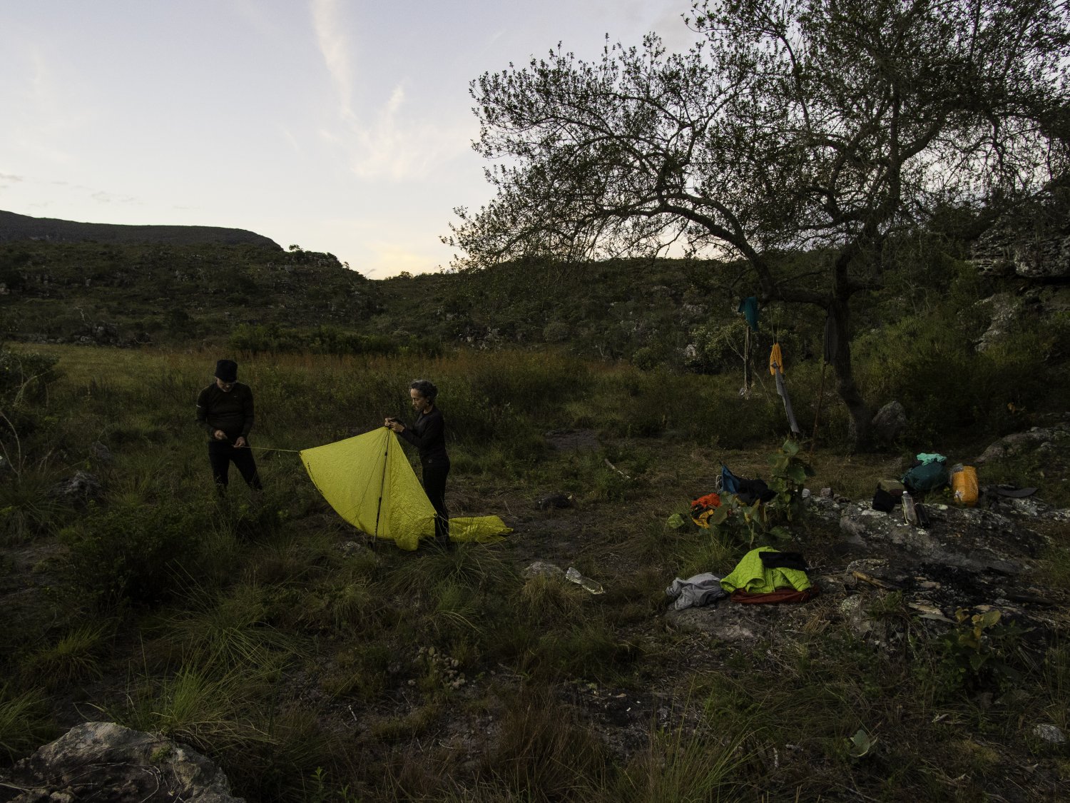 Chegamos à Toca da Docinho, descoberta por Sandra, em janeiro passado. Tomamos um “banho” em um córrego cheio de limo, pegamos água, montamos acampamento e curtimos a noite estrelada e espetacular. Ventou um pouco, mas dentro da tenda tudo estava tranquilo. Peter, que bivacava, teve uns problemas com um vento nordeste. Ele virou crePeter (deixando a lona da tarp cair sobre si) e dormiu o restante da noite.