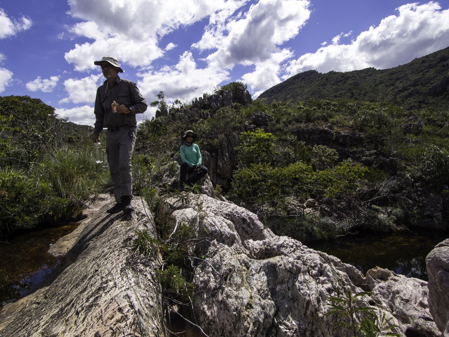 Sobre uma rocha, no leito de um regato, paramos para comer, no mesmo lugar onde acampamos na expedição anterior. Prosseguimos com a descida dos Cristais, passando pela matinha, pela Lapa da Mutuca e avançando rumo ao Itobira