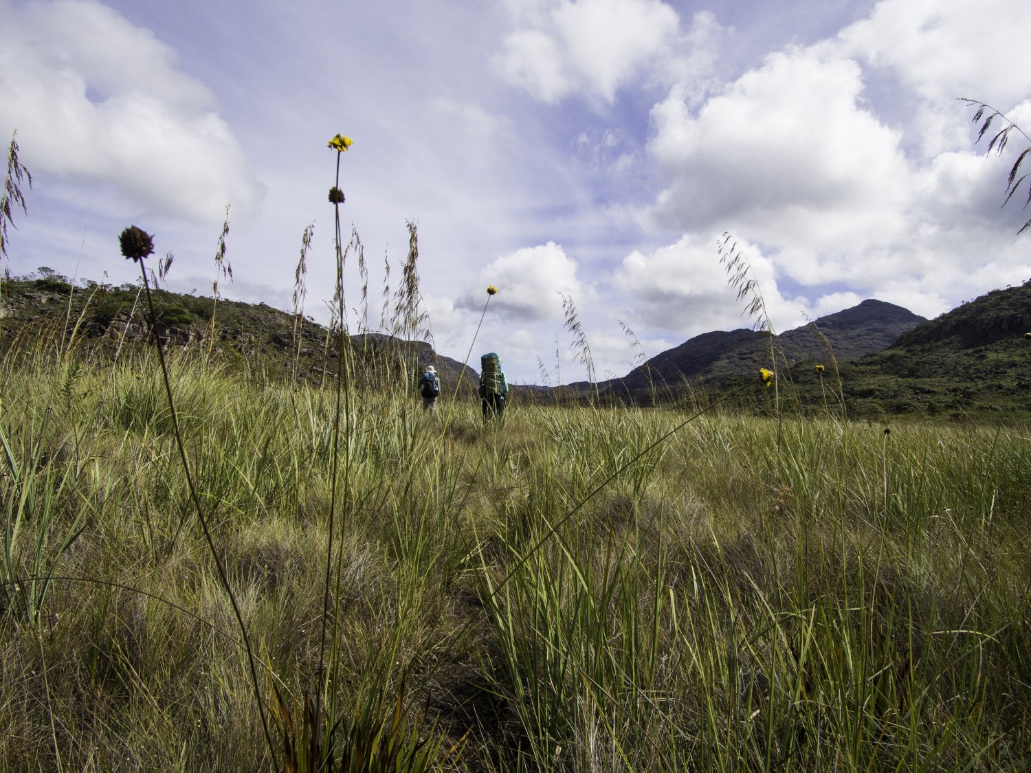 Pensamos em seguir em frente, na diagonal, mais um tempo estudando posteriormente vimos que o terreno seria possivelmente mais fácil , no entanto, a vontade de chegar ao topo e a hora avançada - já era perto das 16 horas - nos fez preferir subir à direita, guinando para o alto. O desnível era pouco, mas havia uma área alagada de capim alto no caminho. Peter, na dianteira, achou rapidamente uma passagem seca no meio do charco e o seguimos.