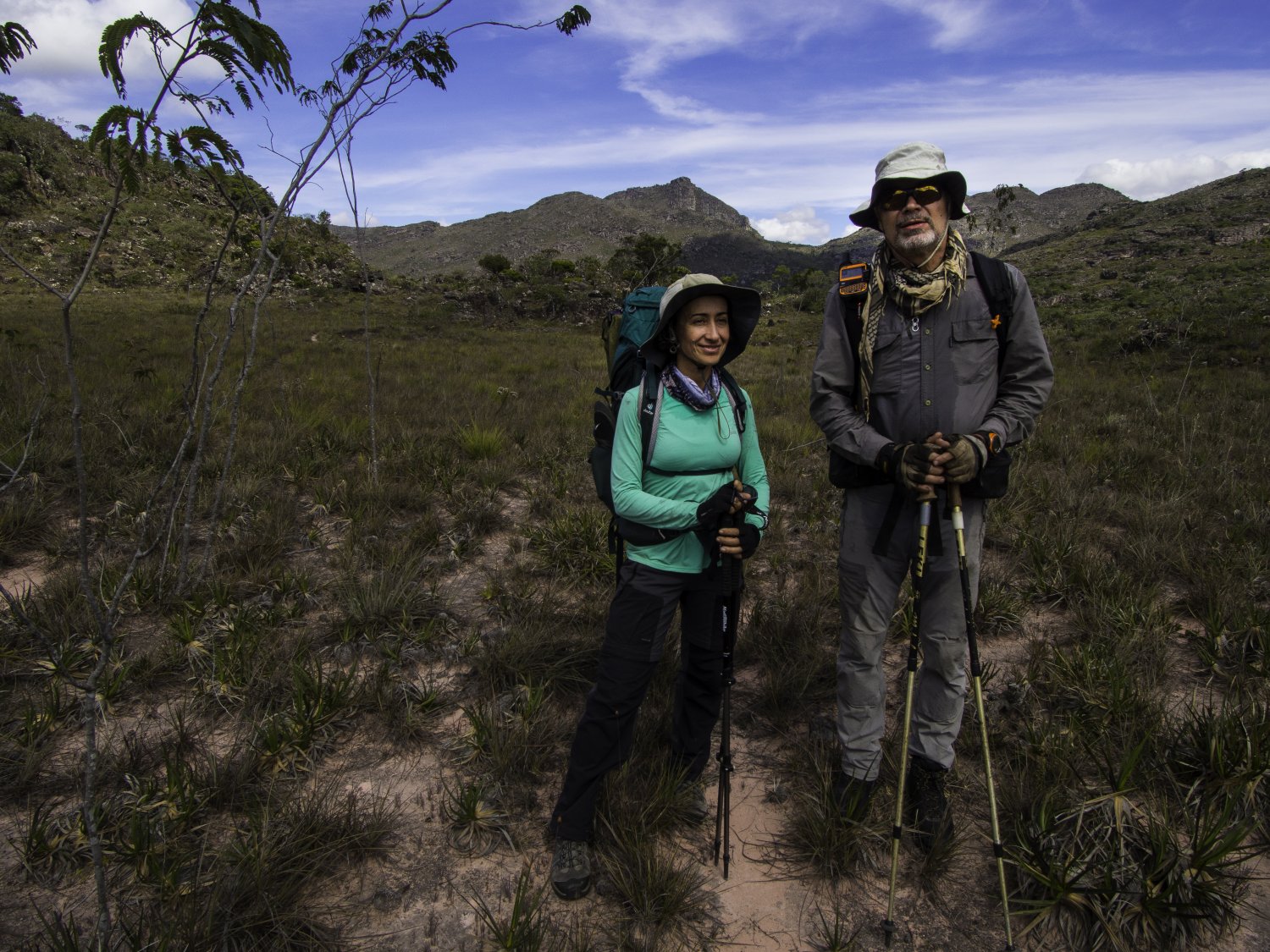 À esquerda ficava para trás uma mata alta, com árvores grossas de onde ouvíamos os Jacús grasnando, como se estivessem avisando da chegada dos invasores humanos. Paramos para descansar e Peter seguiu para tentar ver se avistava um ponto de acampamento que ele tinha feito em uma aventura anterior, na mesma Serra dos Cristais, com a Thais Cavicchioli e Maria Fernanda May (ver o relato dele, de em 2020 “Serras Altas da Bahia”). Eu e Sandra comentamos entre nós sobre a resistência física dele, que sempre nos impressiona.