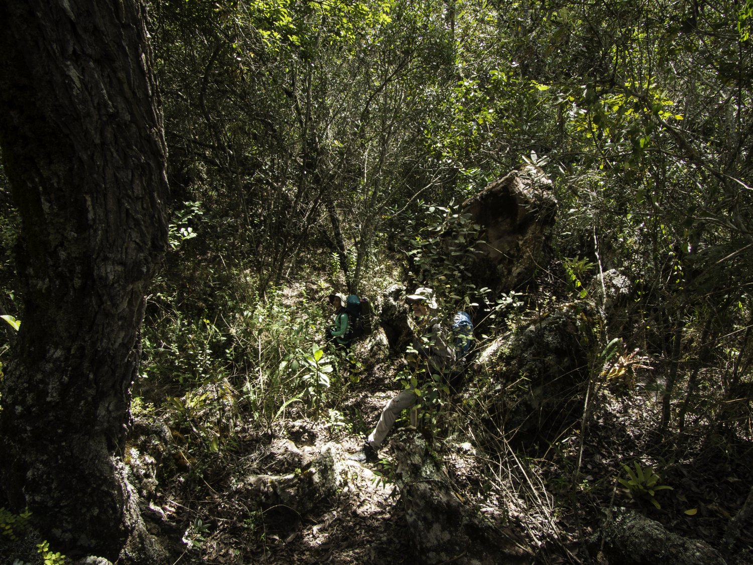 A trilha antes bem marcada ficou suja e conforme nos afastávamos do rio e ganhávamos altitude, tornou-se tênue, teimando em desaparecer o tempo todo. Hora a perdíamos e hora a achávamos. Peter, que rastreava a maior parte do tempo, tem um tino espetacular para encontrar os trilhos. Parece até que usava um tipo de sexto sentido mateiro, porque acabava sempre achando a trilha mais adiante (leia a matéria dele, aqui no Adventure Box: “Rastreamento de Trilhas” e entenda mais sobre isso!).