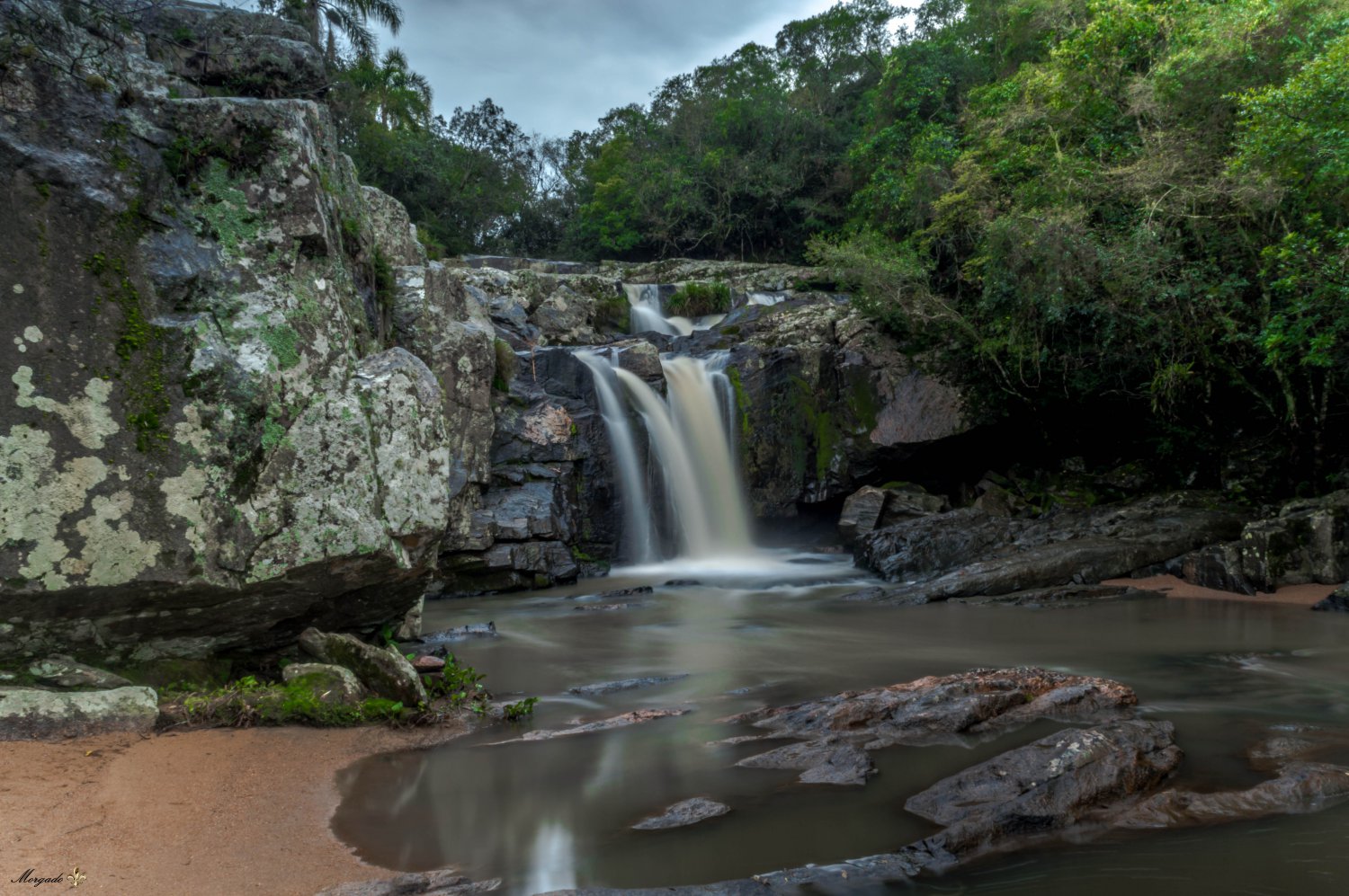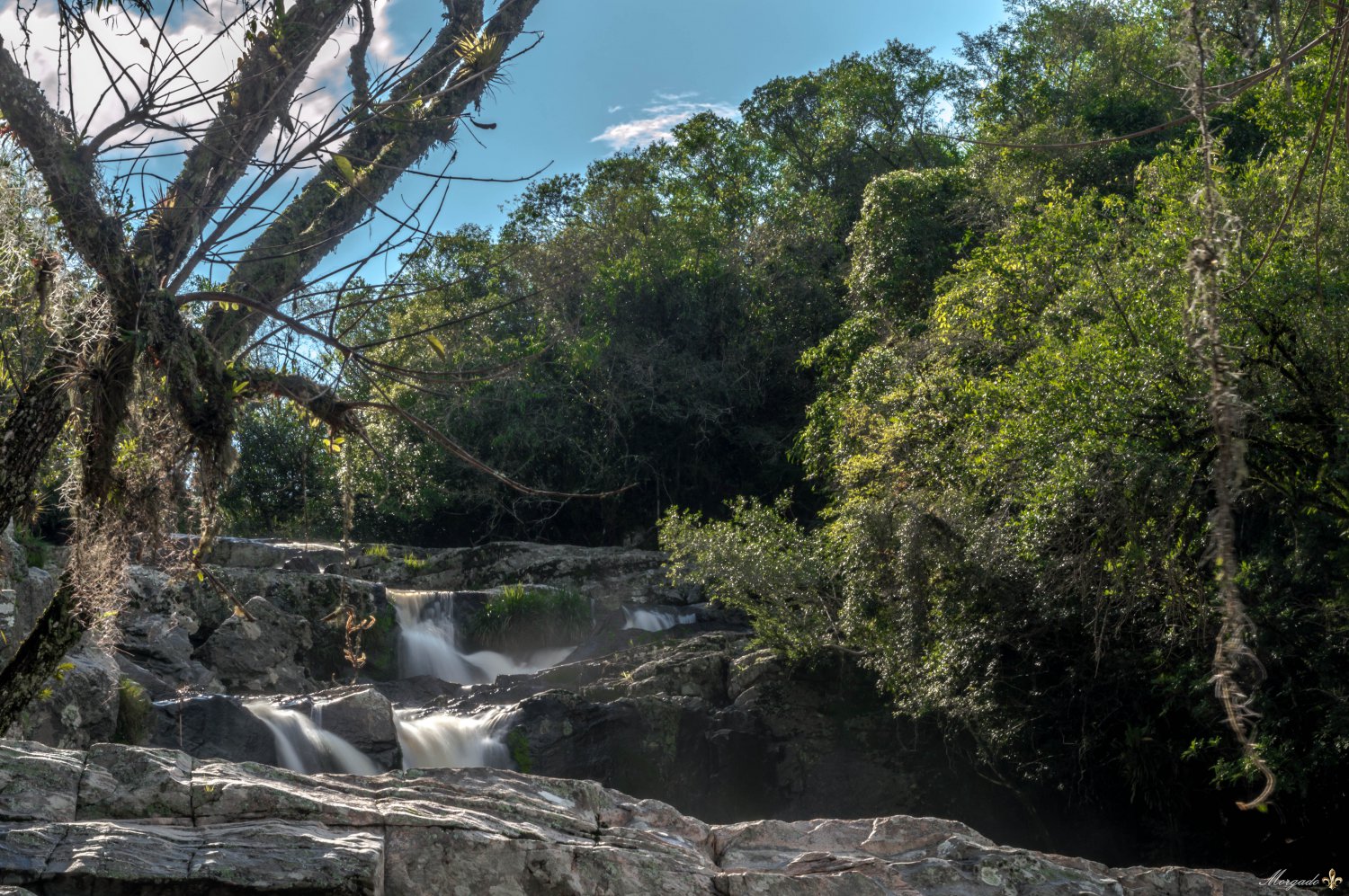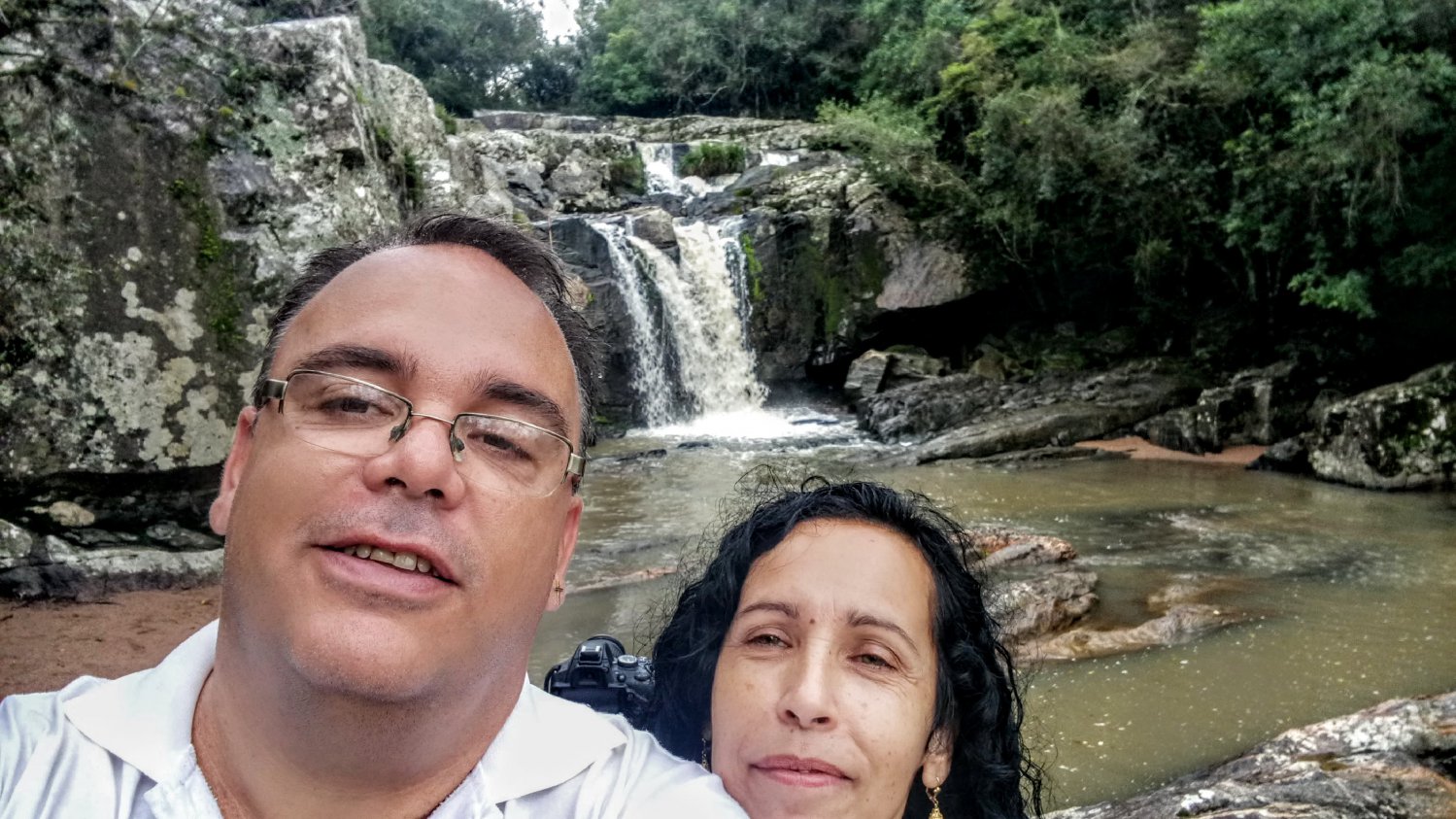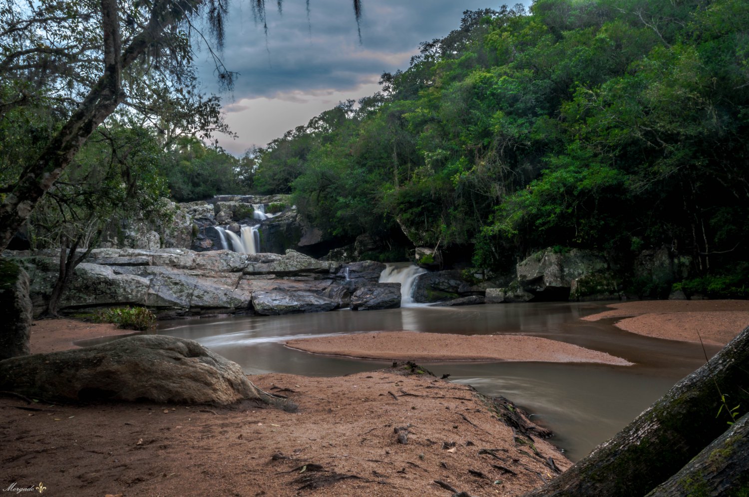 Depois que nos divertimos nas ruínas, voltamos ao Gruppelli pra comer algo, mas o restaurante ainda estava fechado e não tínhamos tempo para esperar ele abrir. Compramos pão caseiro e uma calabresa, e partimos rumo a Colonia Maciel que fica a pouco mais de 11Km de onde estávamos. São subidas e descidas de morros que estavam acabando comigo. Desde que eu tinha voltado ao Bachini(interior de Pelotas também) e caminhado 27Km com a Rosana, eu já tinha engordado bastante(e dando um spoiler, esse vai ser um dos assuntos da próxima aventura), e 11Km eram torturantes. Eu já estava com mais de 100Kg, e mais o material da mochila, era muito peso para subir e descer morros. Mas o gaúcho tem um ditado, "Só está morto quem não peleia!", e os 11Km não me venceram. Chegamos na Colônia Maciel, um pouco antes dela, pra dizer a verdade. Chegamos na Cachoeira do Imigrante, um local bem agradável, bem cuidado, com mesas e churrasqueiras, e estruturas para colocar lonas e se esconder do sol, ou chuva :-) Descemos até a cachoeira por uma estradinha demarcada com latas, para que se enxergue a noite. O tempo ainda não me ajudava, não era muita chuva, mas mesmo assim não podíamos expor nosso equipamento. Quando chegamos na cachoeira, demos umas voltas, subimos nas pedras(a Rosana é mais cautelosa nesse critério), observamos a cachoeira mais de perto. Descemos as pedras e voltamos para "a base". Fizemos nossa tradicional selfie nos locais.
