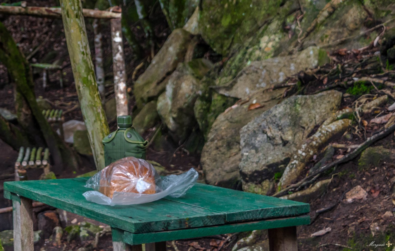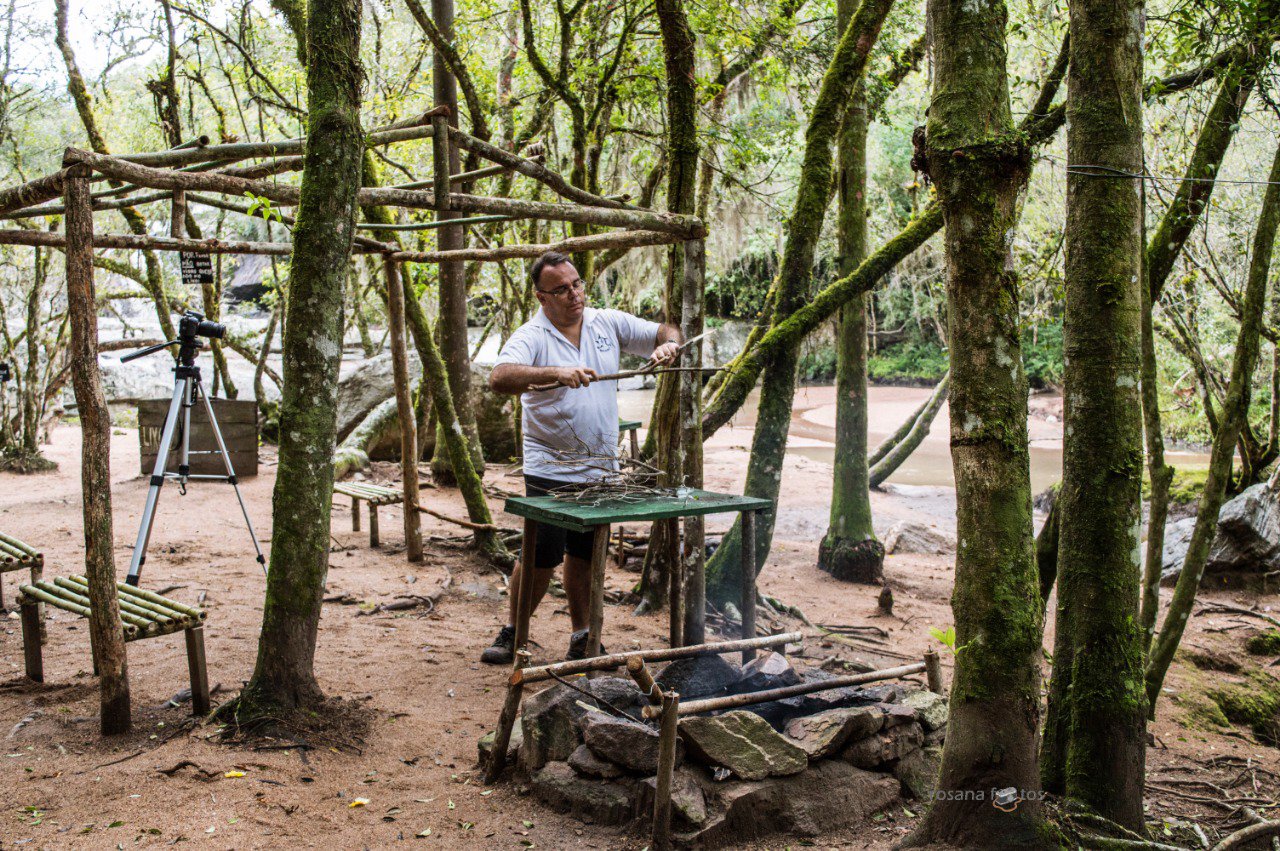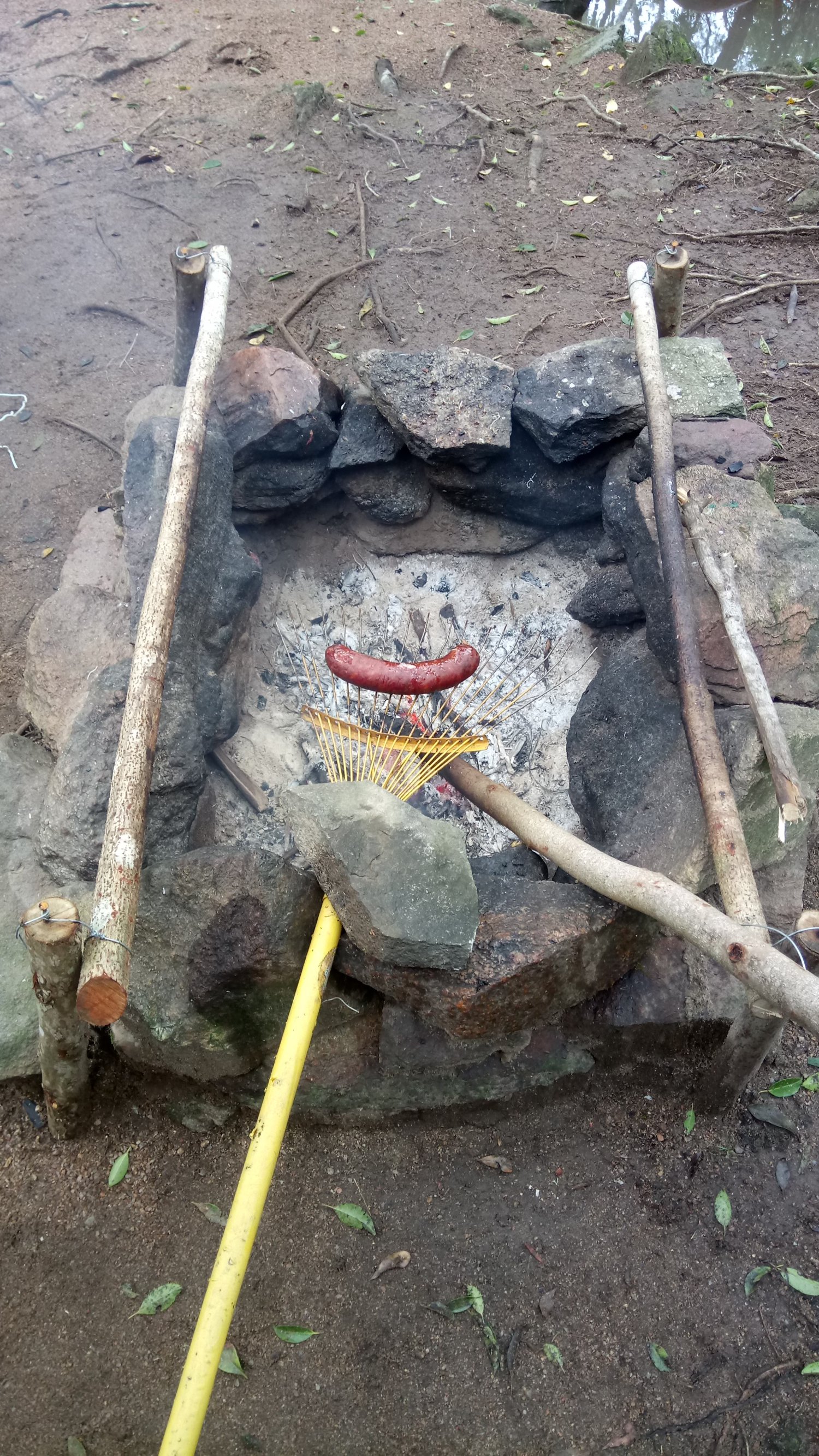 Já tinha passado do meio dia e a fome bateu. Começamos a procurar lenha, de preferência as mais secas, e numa sacada de gênio, a Rosana achou um ancinho, que transformamos em uma grelha pra colocar a calabresa e não comer cru no meio do pão!