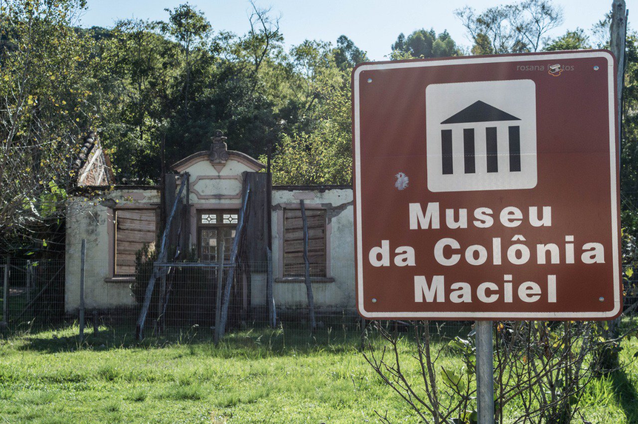 Na entrada da Colônia Maciel tem um prédio que desabou com um temporal. Alí ficava o museu. Na hora pensei que havia se perdido todo o material, mas depois, informado por um professor da Universidade Federal de Pelotas, que quase 100% do material não sofreu dano algum. Chegamos ao ponto de ônibus com o Chulé ao nosso lado. Ficava na frente da Igreja do local.