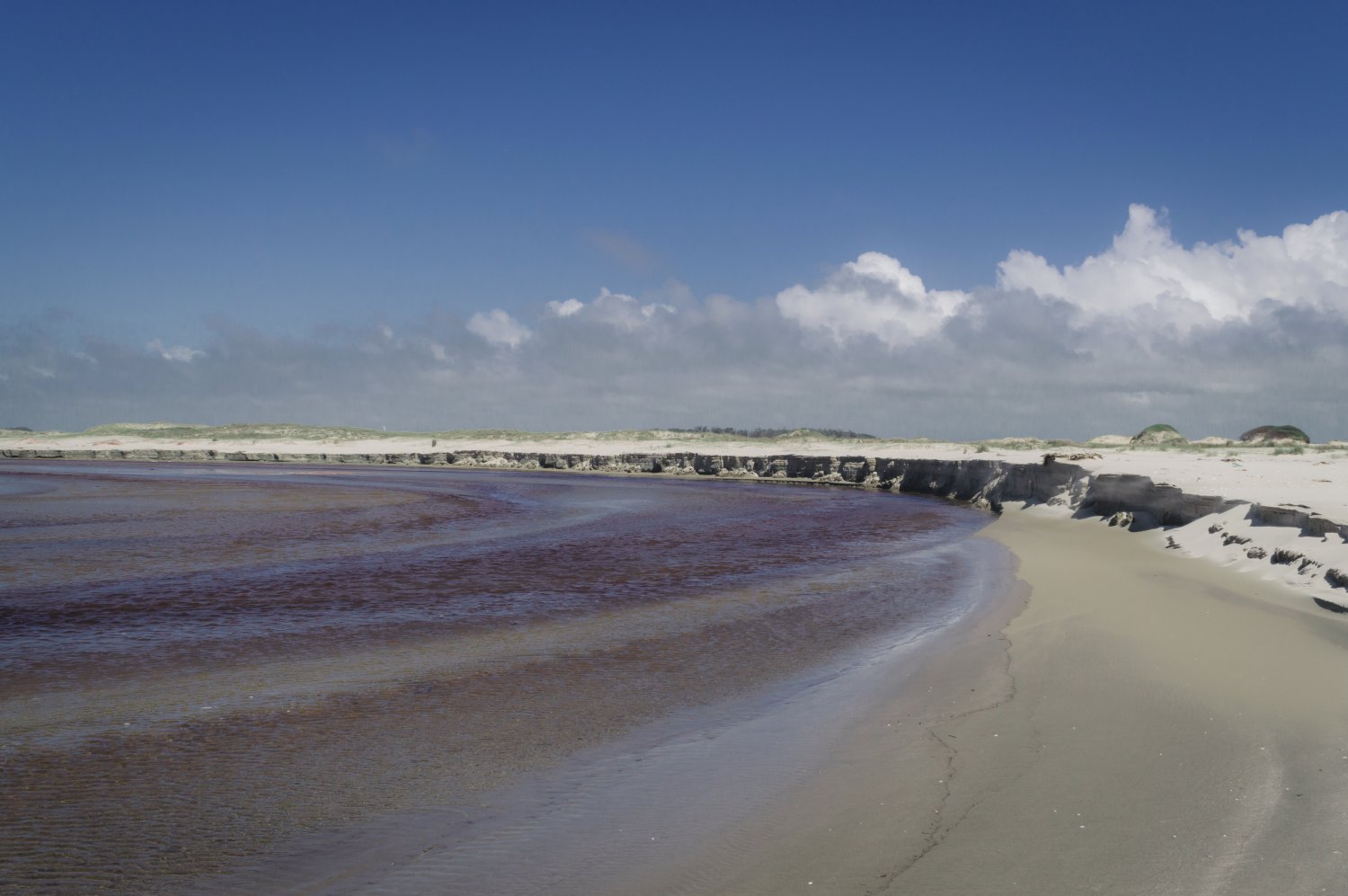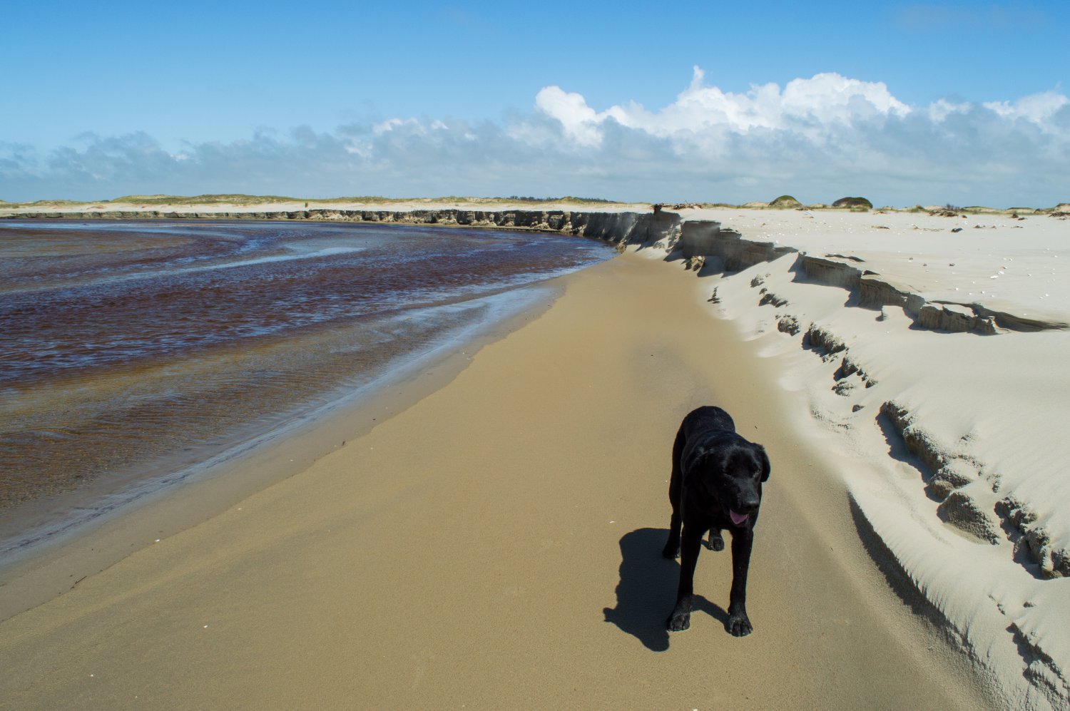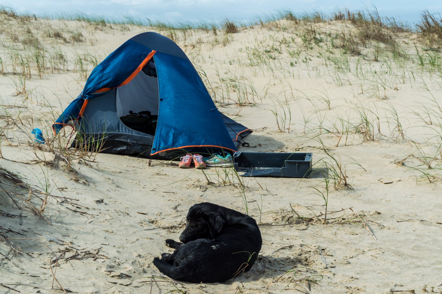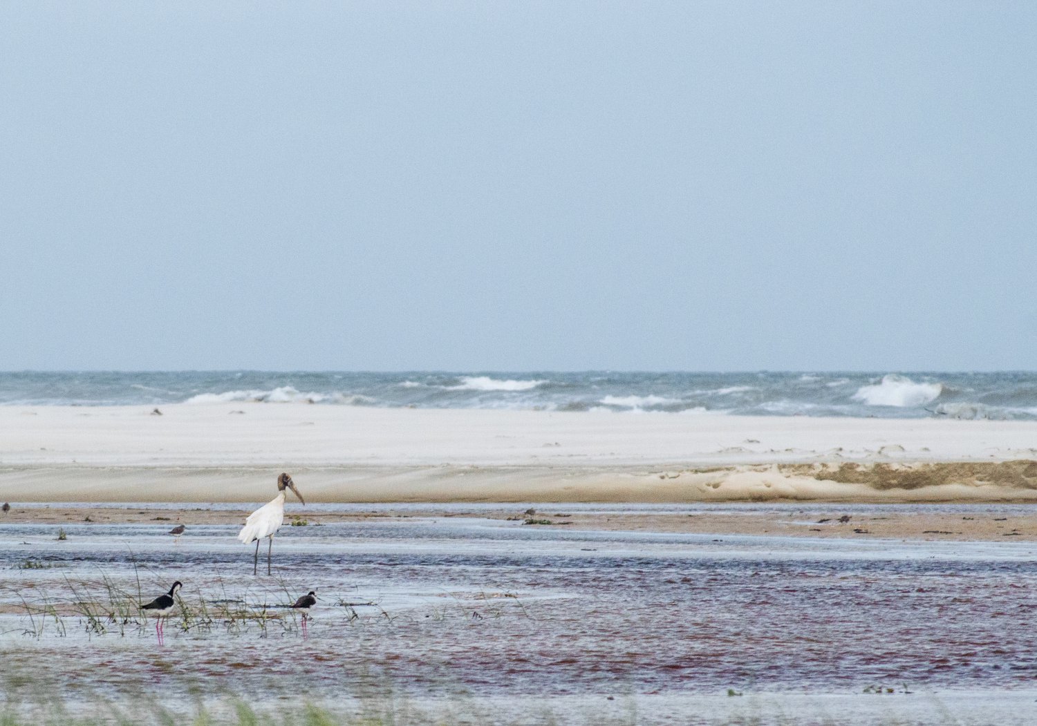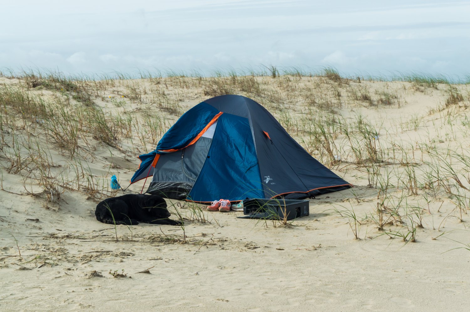 Montamos acampamento longe da beira da praia, entre duas partes de uma duna, onde enxergávamos a praia, mas não éramos vistos de lá, próximo ao riacho. Com a observação das nuvens e do vento, resolvi montar a barraca de frente para o sul, o que aqui, pelo menos, não é indicado. Tomei esta decisão porque eu estava vendo as chuvas passarem por nós pelo continente, ou seja, o oceano não estava “puxando” e o vento estava colaborando. Mas, mesmo com o vento colaborando, cada rajada “entortava” toda a barraca!