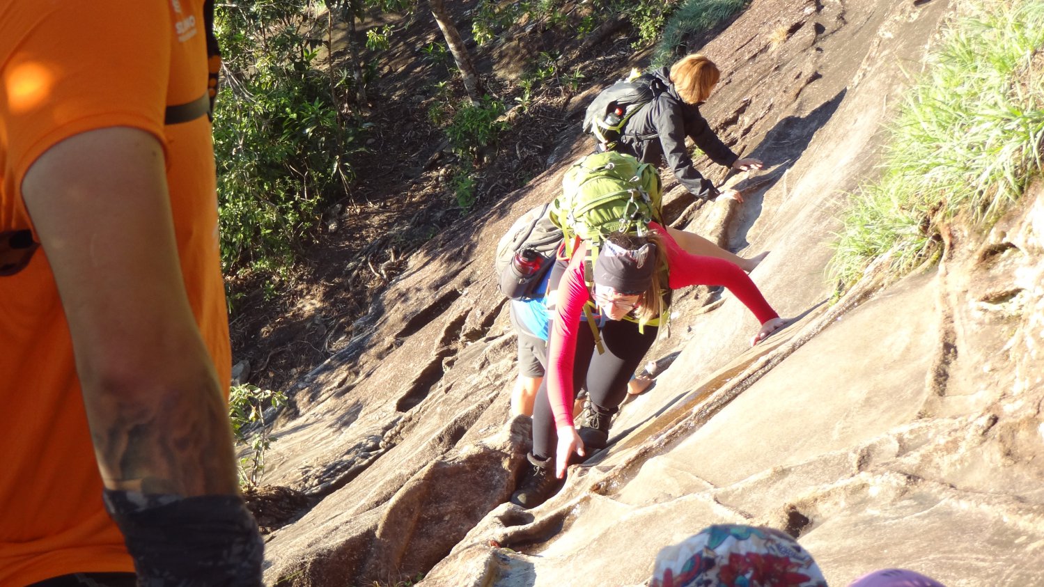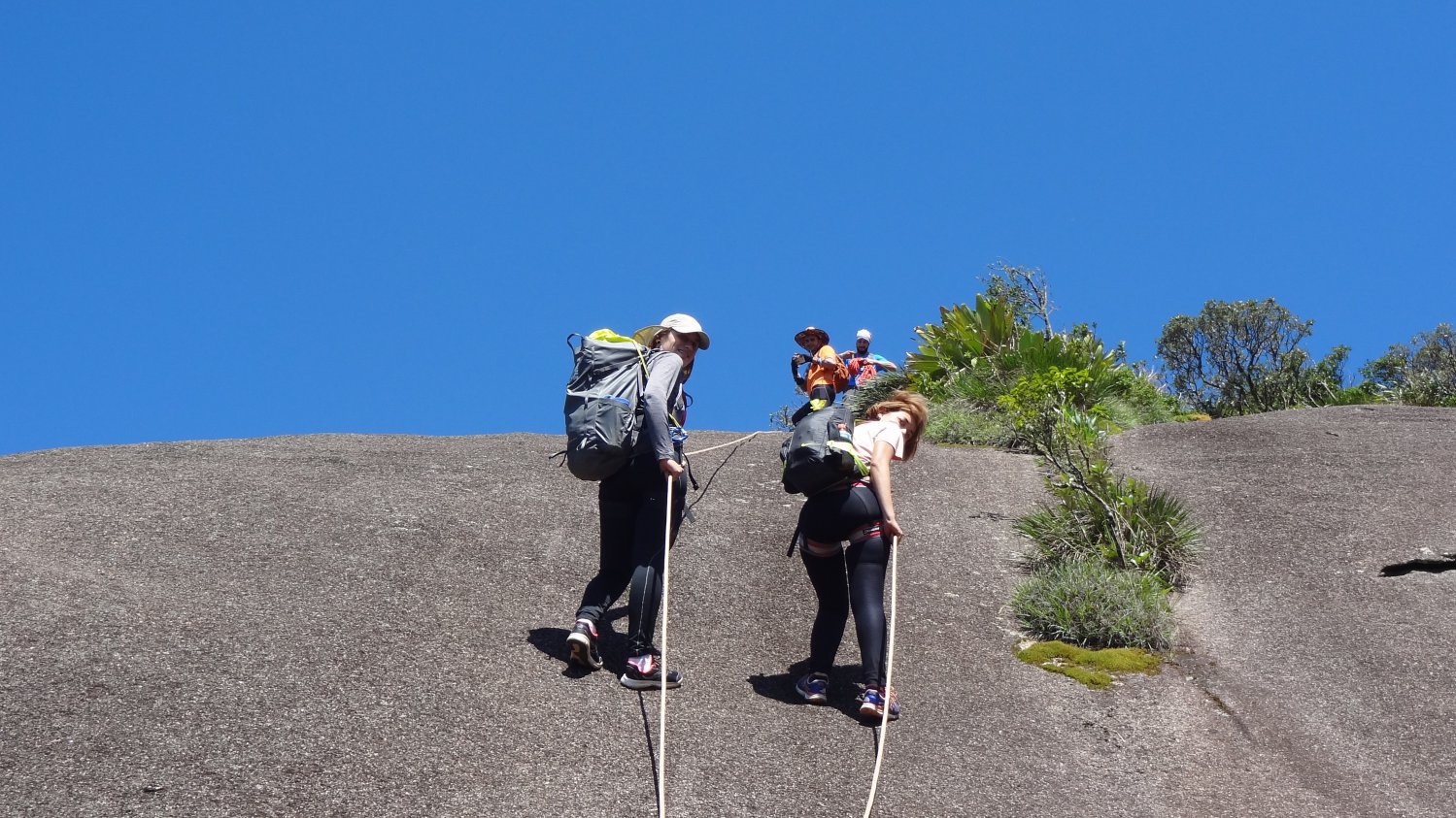 A subida tem poucos lances que sejam técnicos, li em algum lugar que é considerado uma escalada de grau 1. O maior desafio está na parte psicológica devido a exposição de vários trechos. Todos do grupo estavam com equipamentos de segurança e eu ainda estava com uma cargueira com 50 metros de corda o que sempre dificulta um pouco a mais.