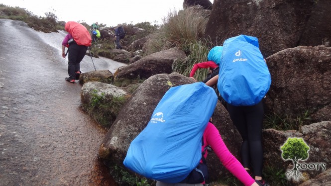 Chegamos no Abrigo do Marins aproximadamente as 05 da manhã da sexta feira e fomos recebidos com uma garoa fina, mas como já tinhamos ido até ali não era hora de desistir, bora regular as mochilas que é hora de começar a subida. Nem precisamos usar lanternas no começo da caminhada, as 05 da manhã já estava claro o suficiente para ser seguro caminhar sem lanterna.
