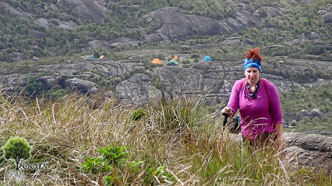Subindo o Marins sem as cargueiras, acampamento ao fundo.