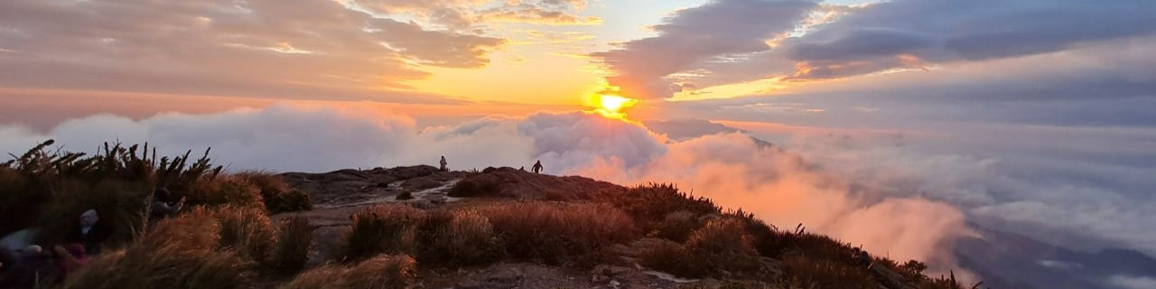 A previsão do tempo dias anteriores era boa, sem chuva, clima propício e favorável para a travessia, e isso se confirmou quando chegamos ao cume dos Marins, após uma deliciosa escalaminhada no íngreme paredão de rocha separa a base do cume. Lá chegando, fomos presenteados com aquele astro rei astronômico em meio a tapetes de nuvens deformados e o fato da Ana estar presente também ajudou essa afirmativa, pois ela é considerada um amuleto do clima bom em travessia haha. Os primeiros raios tocaram nossa pele em gratidão a conquista, e em certo momento ouvi alguém gritando!