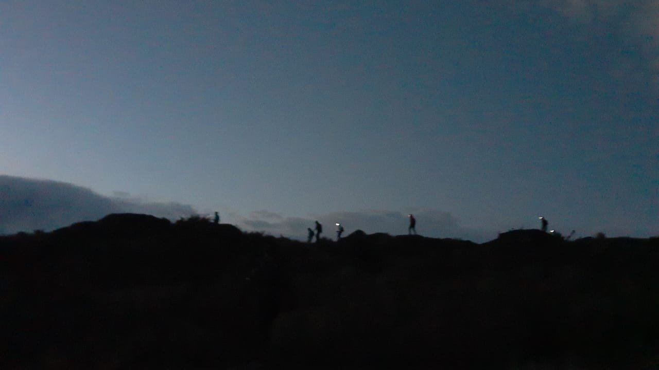 - 4 da manhã mano e esse bando de louco! Essa é a frase que ouvi logo no início, saindo lá base do Dito, e que resume bem toda travessia, todos com suas head lamps, emcapados com anoraks e corta vento, pois a essa hora a temperatura beirava os 10º. Começamos em ritmo bom, pernada forte rumo ao Morro do Careca, que alcançamos sem muitas dificuldades, mas havia aquele dilema - Atacaremos os cumes? Tudo dependeria do nosso rendimento durante o trekking, que até esse momento se resumia em caminhar em uma subida bem íngreme com aprox 15º graus de inclinação, em terreno pouco acidentado. Mas a brincadeira só estava começando...