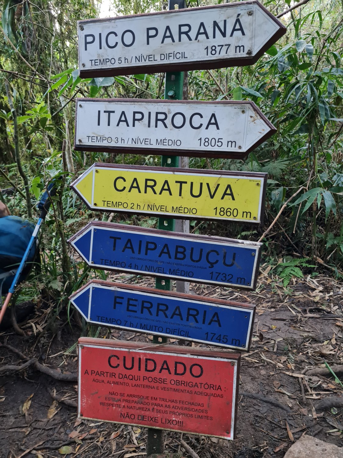 Pois então chegando na Fazenda Pico Paraná, começamos com pernada forte rumo ao Taipa, noss primeiro destino. Logo após umas horas de súbida entre raízes, em meio a Mata Atlântica, sentimos falta de um dos integrantes, o Victor, que provavelmente havia ficado para trás. Com o espírito de companheirismo e equipe, nosso "anjo" Carlos foi desceu em sua busca, enquanto o restante do grupo prosseguiu rumo ao destino. Como não acamparíamos nesses cumes, eles são feitos de ataque, então tratamos de "muquiar" as cargueiras e subir com mochilas de ataque só com o necessário. A subida para o Taipabuçu é considerada nível médio, com alguns lances de trepa pedras e raízes, o que não demandou muito tempo. Mas chegando ao seu cume é que os problemas começam. Avistar a leste o Pico Ferraria e o Vale que é necessário descer para atáca-lo faz sem sombra de dúvidas jus ao nome "Desafio Extremo". Nesse ponto, o grupo já estava um pouco dividido e logo atrás notei que a companheira Milena vinha também em ritmo forte. Pois bem, assinamos rapidamente o livro do Taipa e descemos, sentido ao grande e imponente Ferraria.