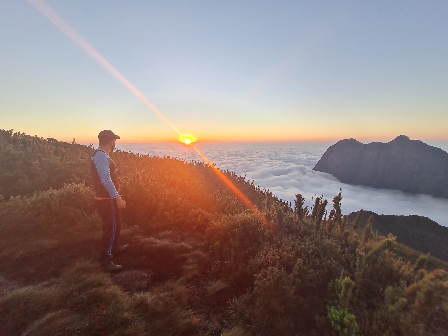 No segundo dia o tapete de nuvens continuava lá, intacto e infinito. Foi a primeira vez que tive essa honra, de apreciar essa estonteante obra da natureza, diga-se de passagem, a que mais admiro. Em seu meio, lá estava o estrondoso Pico Paraná, com seu geologia peculiar. O PP, carinhosamente apelidado de Everest Brasileiro, é a maior montanha do sul do país. Lá ao fundo do majestral tapete, o horizonte de cores cintilantes já apontava o nascer do astro rei! Uma das visões mais belas que tive o orgulho de presenciar. Agradeço aqui ao parceiro Guilherme pelo registro: