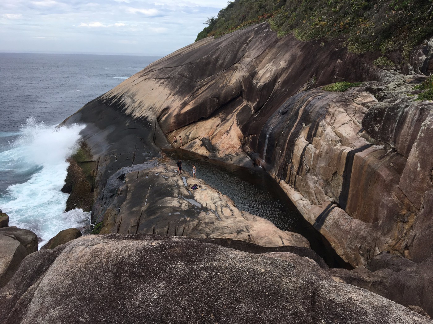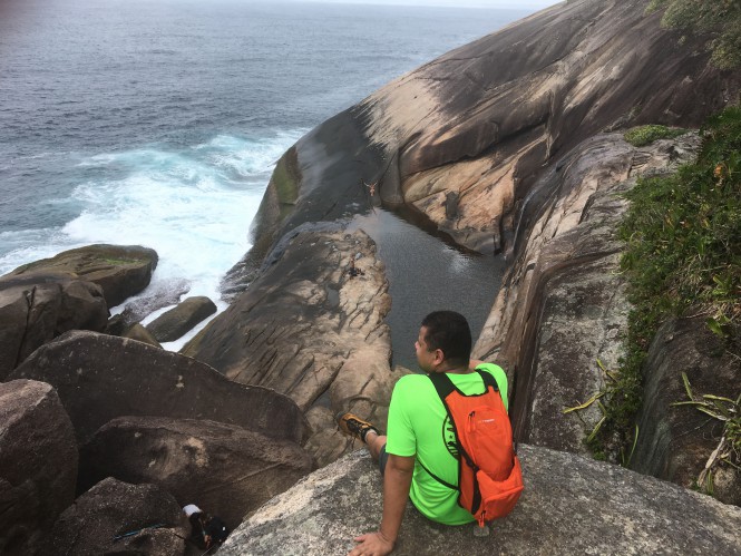 Chegando lá, a vista é incrível, o mar, as pedras, a cachoeira. A descida até a cachoeira apresenta um pouquinho de dificuldade, pois é necessário descer uma pedra com uma certa altura. Há algumas cordas fixadas para auxiliar.