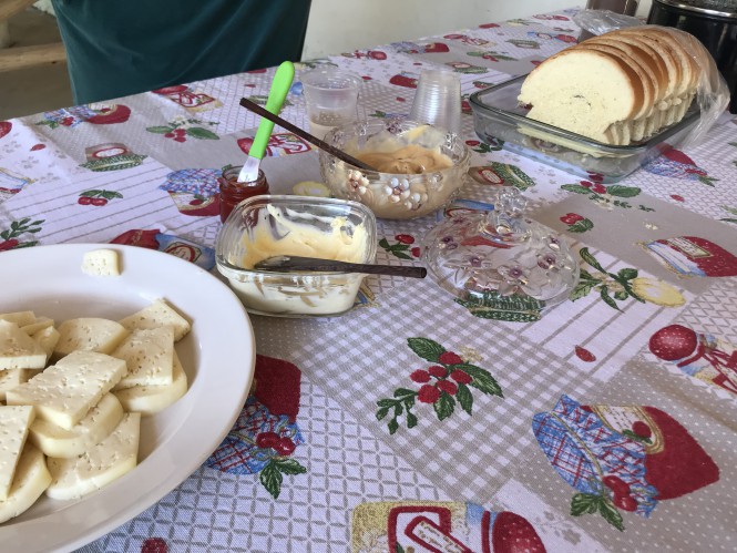 Chegamos a um sitio, e fomos recebidos por uma moça sorridente, a Silvana. Pega-se R$ 10 para a visita e vc tem direito a um café, e num é um cafézinho preto só não, a Silvana capricha, tem pão caseiro, queijo fresco, leite, doce de leite caseiro e uma geleia de tomate deliciosa ( Claro, é a terra do tomate!!!), td isso acompanhado de uma prosa boa!!!