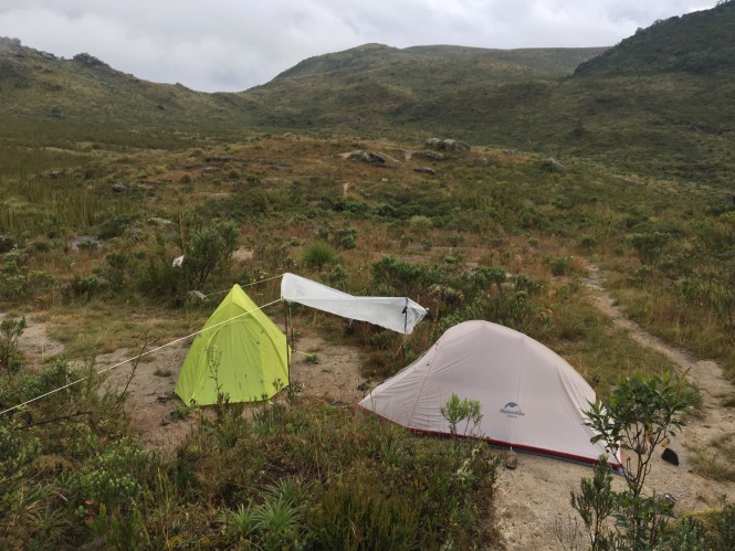O melhor local para acampar estava, digamos, meio alagado e muito úmido. Decidimos testar e montar acampamento em solo rochoso e aprender um pouco com isso.