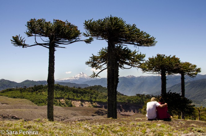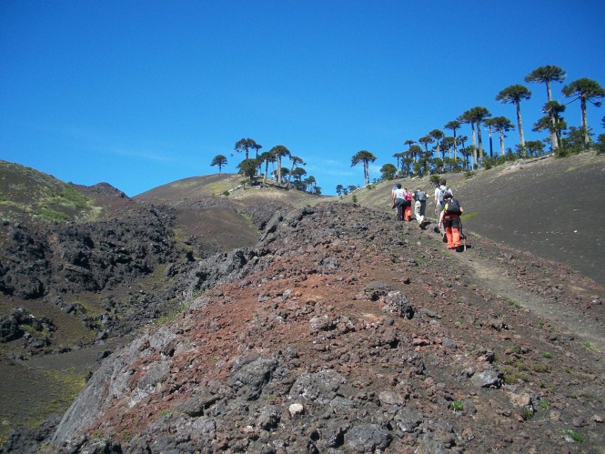 O caminho entre uma pequena floresta de Lengas e Araucáreas é a única sombra que se vê durante toda a subida, depois de chegar ao final dela temos que passar por um campo de lava petrificado e logo depois chega a bendita areia fofa. Ao final da floresta você já tem uma visão dos outros dois vulcões da área, Llaima e Lonquimay, além de vales e lagos.