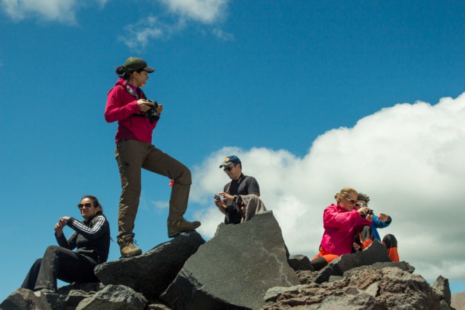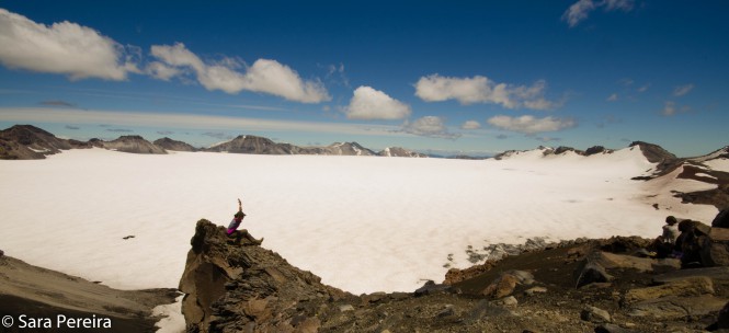 Todo o esforço é recompensado quando se chega ao cume do vulcão, ele possui uma cratera com +-5km de extenção que está coberto por um glaciar que tem uma profundidade média de 200m. Resumindo, é de tirar o folêgo (mais que a subida). É tão impressionante que não consigo colocar em palavrasa sensação de olhar lá de cima, deixo a foto para que cada um tire suas conclusões.