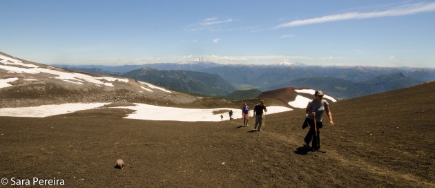 O caminho entre uma pequena floresta de Lengas e Araucáreas é a única sombra que se vê durante toda a subida, depois de chegar ao final dela temos que passar por um campo de lava petrificado e logo depois chega a bendita areia fofa. Ao final da floresta você já tem uma visão dos outros dois vulcões da área, Llaima e Lonquimay, além de vales e lagos.